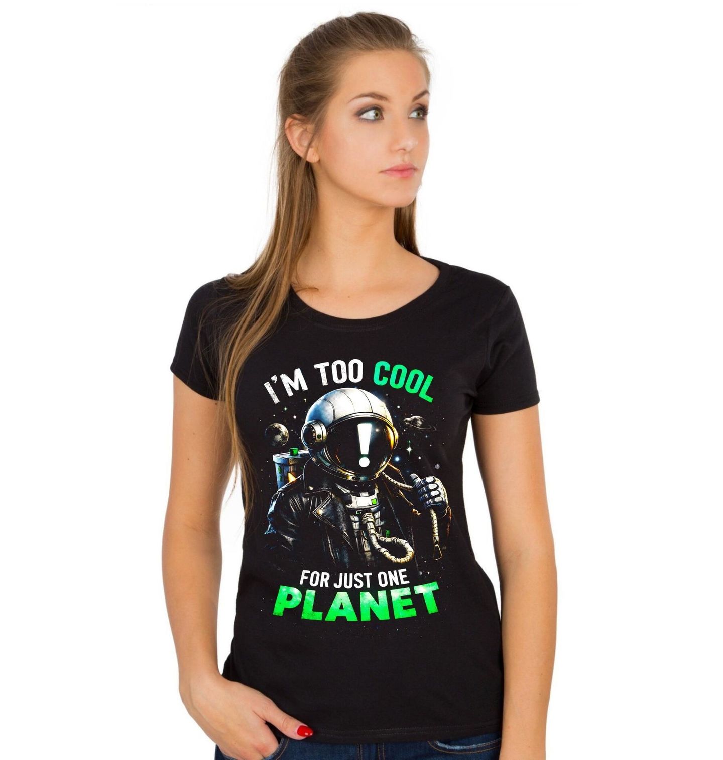 Dámské tričko Astronaut Jsem až moc cool jen pro jednu planetu. “I’m too cool for just one planet”. Originální motiv zobrazuje stylového astronaut, který si razí vlastní cestu napříč nekonečným vesmír. V kožené bundě a s výrazem absolutního klidu působí jako rebel mezi hvězdami – někdo, kdo se nevejde do běžných pravidel jedné planety. Vesmír v pozadí, planety a hvězdy dotváří atmosféru svobody, nadhledu a nekonečných možností.