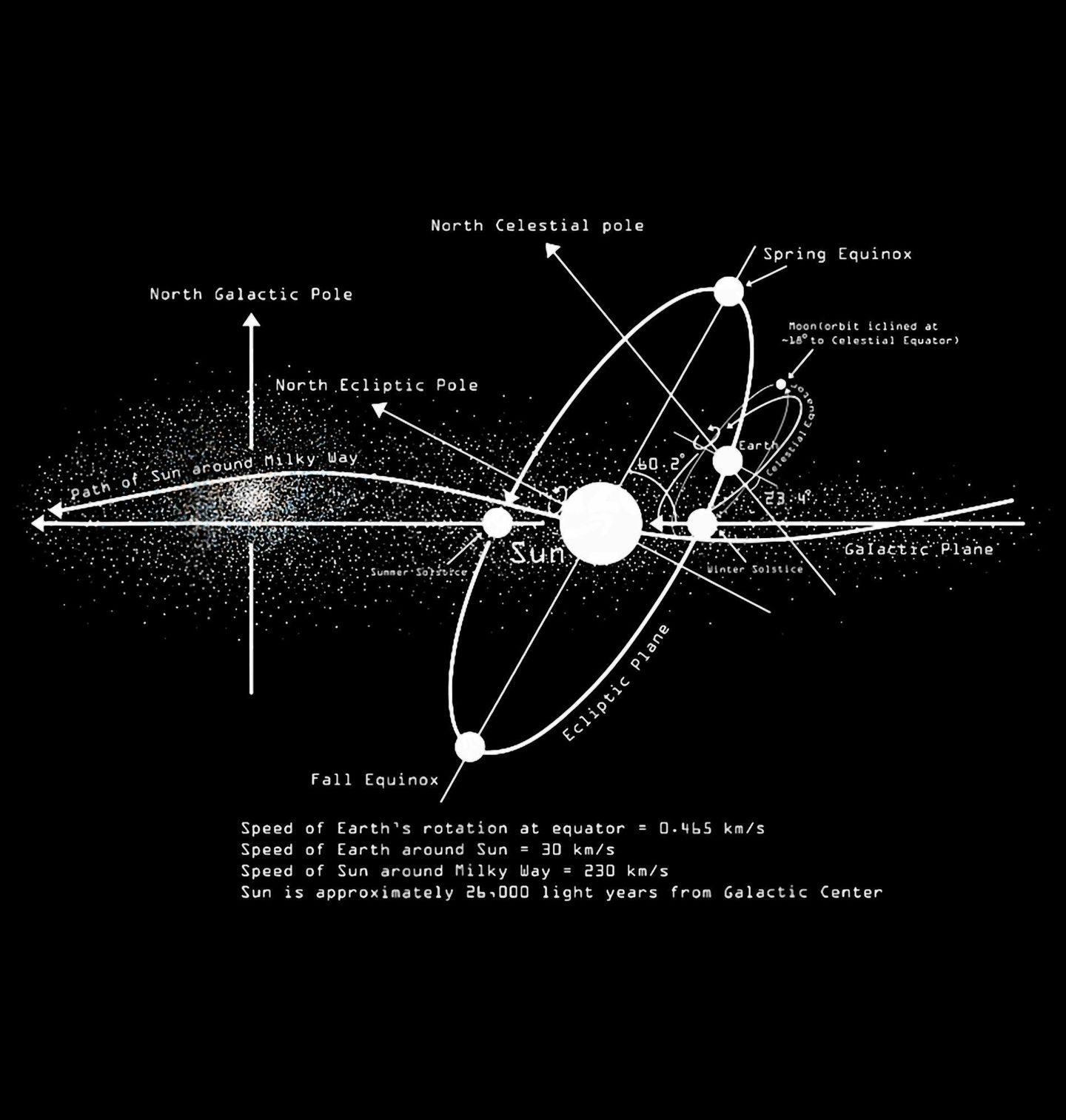 Dámské tričko Astronomický Diagram. Detailní vědecký motiv se sluneční soustavou zobrazuje vztahy mezi Zemí, Sluncem a galaktickou rovinou. Na obrázku najdete pojmy jako „North Celestial Pole“ (severní nebeský pól). Tento design je ideální pro studenty, učitele i fanoušky vesmíru, fyziky a astronomie.