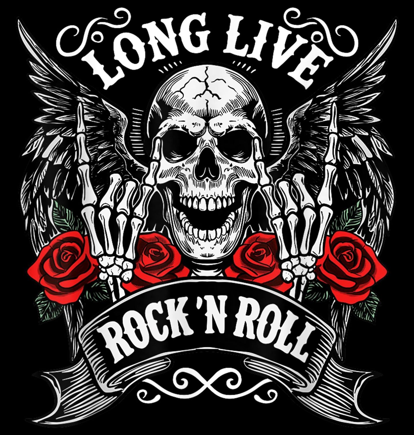 Pánské tričko Ať žije Rock and Roll Long Live Rock ’n’ Roll. Lebka s růžemi vyjadřuje nespoutanost a sílu, růže dodávají motivu vášeň a emoce, které rock and roll přináší. Tento design je ideální pro fanoušky hudby, kteří milují koncert, festival i každá pořádná párty, kde zní hlasitá kytara a energie proudí davem. Pokud je pro tebe kytara symbolem svobody a hudba způsobem života, tento design jasně ukáže tvůj styl.