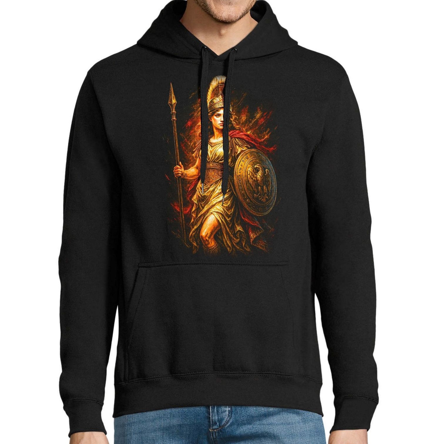Pánská mikina Athéna Bohyně Moudrosti a Války. Pallas Athéna je v řecké mytologii dcera nejvyššího boha Dia. Řecká mytologie popisuje Athénu jako patronku města Athény, ochránkyni hrdinů a zosobnění rozumu i spravedlivého boje. Na štítu často nese symbol moudrosti a ochrany, zatímco její přilba a kopí představují připravenost čelit jakékoli výzvě.