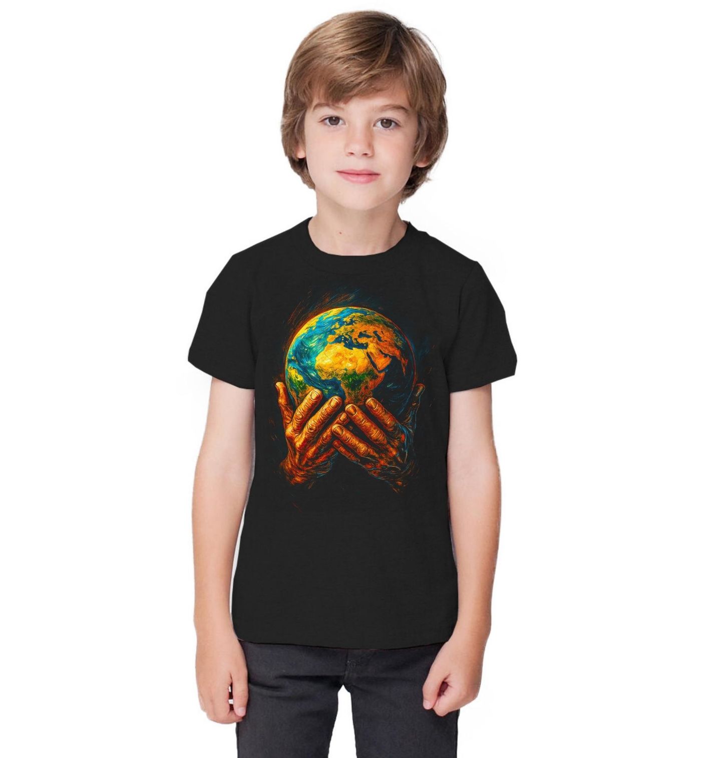 Dětské tričko Atlas a Nebeská Klenba. Silný a hluboký motiv zachycuje symboliku, kde celý svět drží lidské ruce – odkaz na mytickou postavu atlas, která nesla tíhu nebes i existence. Každý člověk totiž nese svůj vlastní svět. Detailní zpracování rukou a realistická zeměkoule vytváří silnou emoci – zodpovědnost, sílu i křehkost zároveň. Atlas zde představuje vytrvalost, odhodlání a schopnost nést břemena života bez ohledu na překážky.