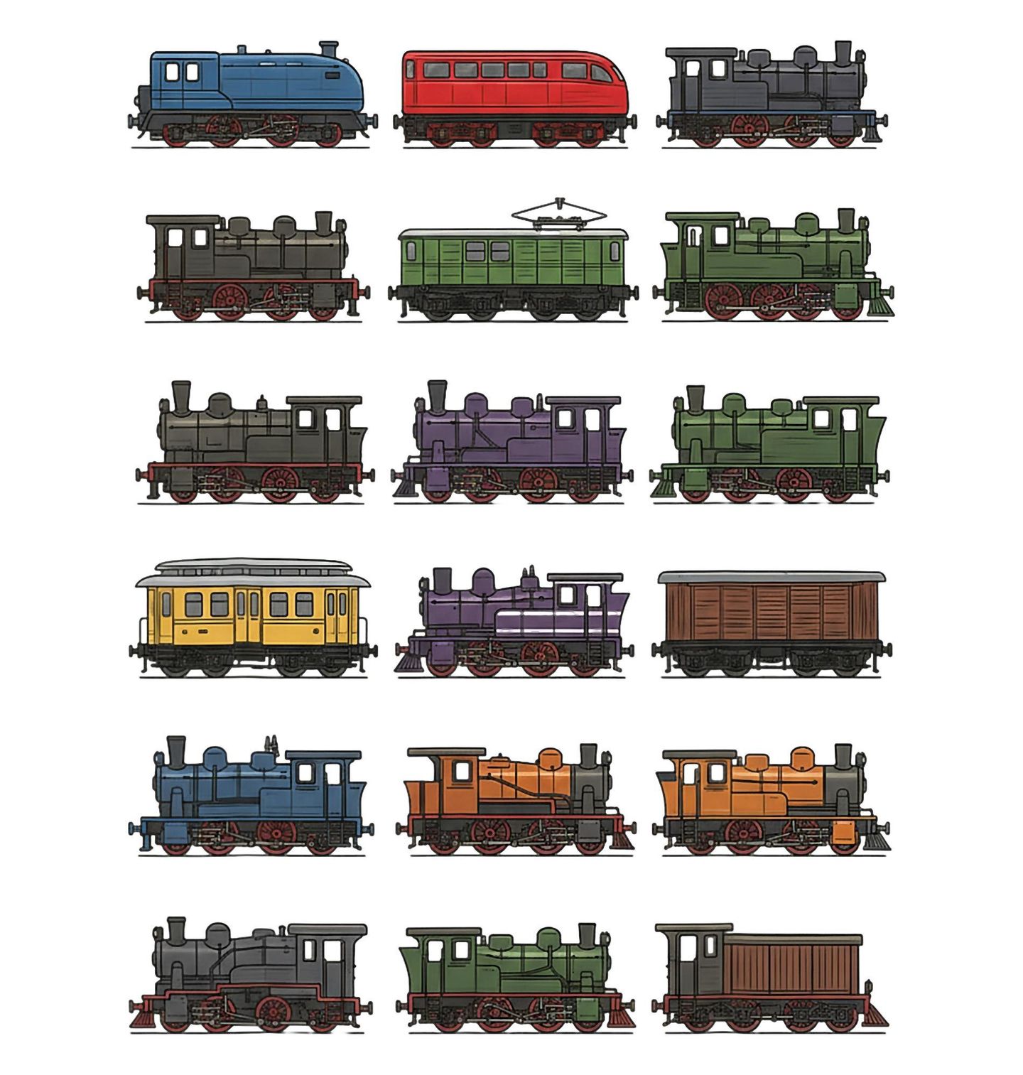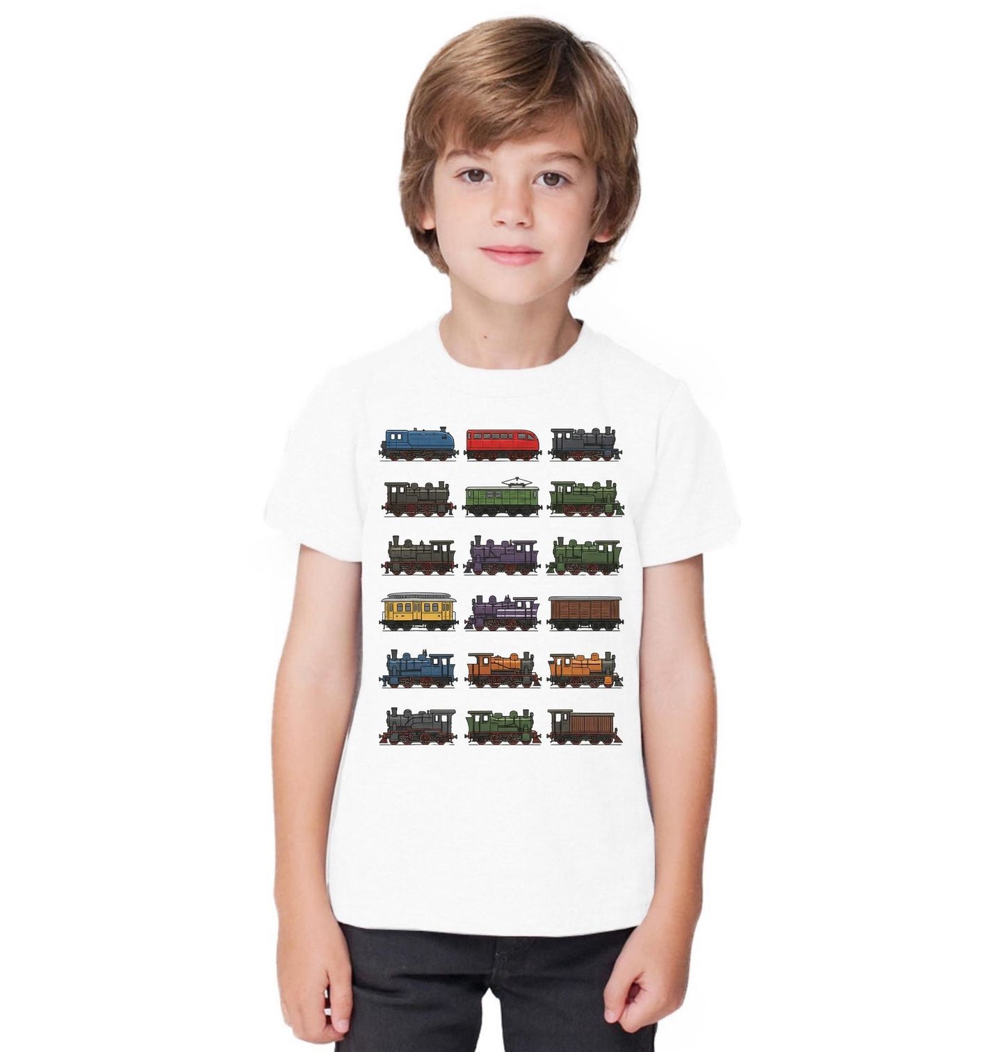 Dětské tričko Atlas Lokomotiv. Detailní ilustrace zobrazující různé typy historických vlaků a parních strojů v retro stylu. Lokomotiva zde symbolizuje technický pokrok, nostalgii i romantiku starých železnic. Ideální motiv pro milovníky vlaků, železnice a historie dopravy.