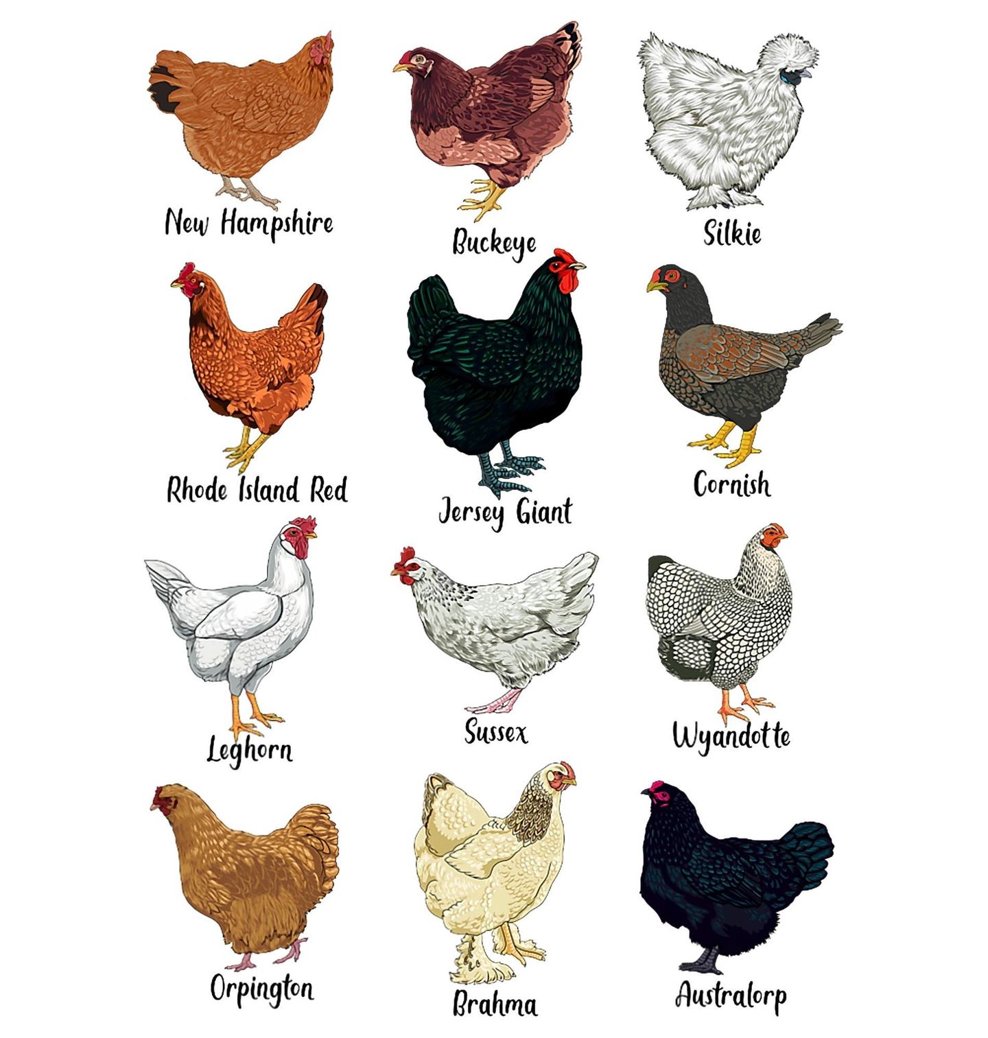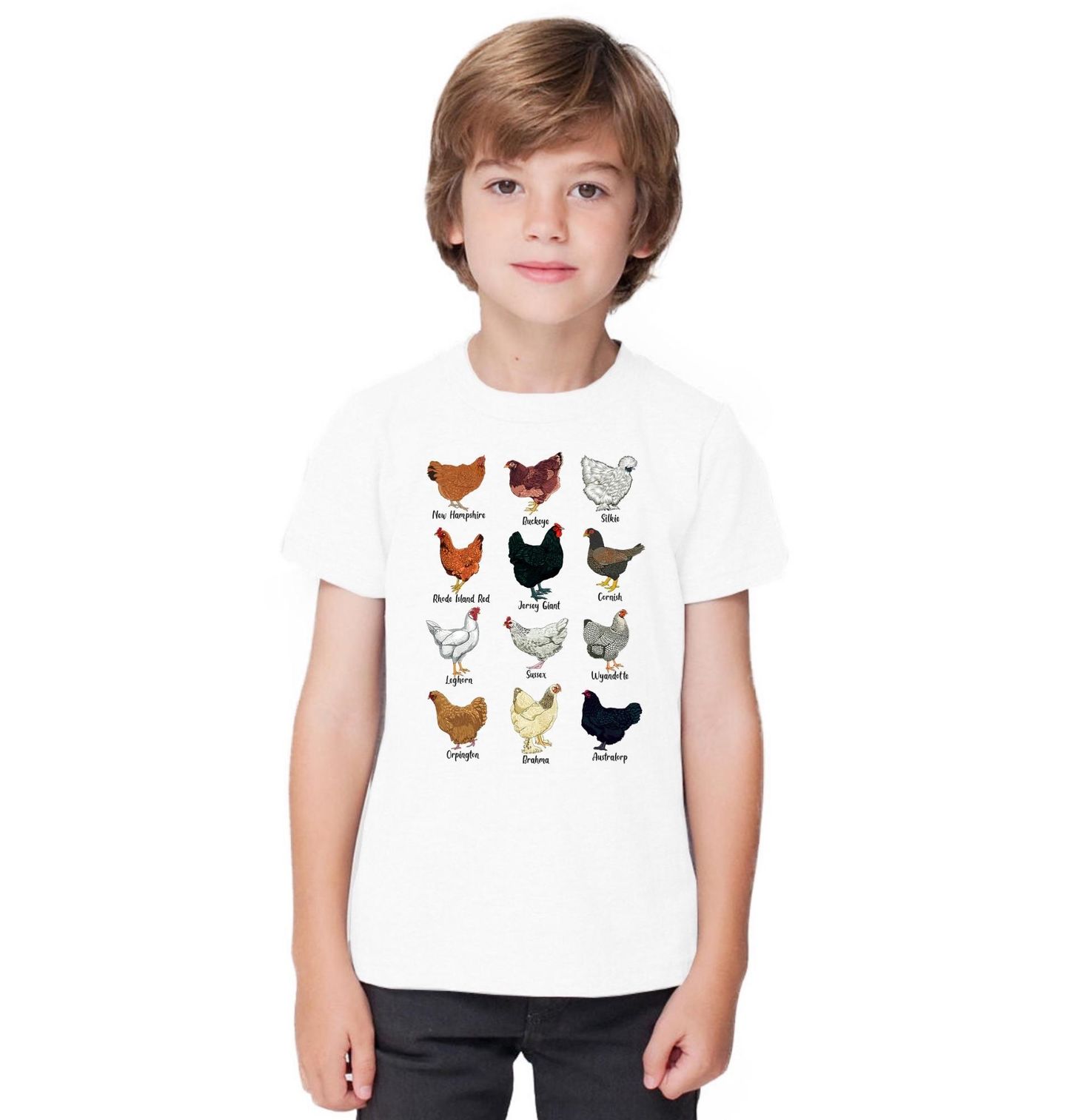 Dětské tričko Atlas Slepic. Přehledná ilustrace ukazuje různé druhy slepic, například New Hampshire, Buckeye, Silkie, Rhode Island Red, Jersey Giant, Cornish, Leghorn, Sussex, Wyandotte, Orpington, Brahma a Australorp. Každé plemeno je detailně zpracováno a pojmenováno. Vhodné pro chovatele i milovníky drůbeže.