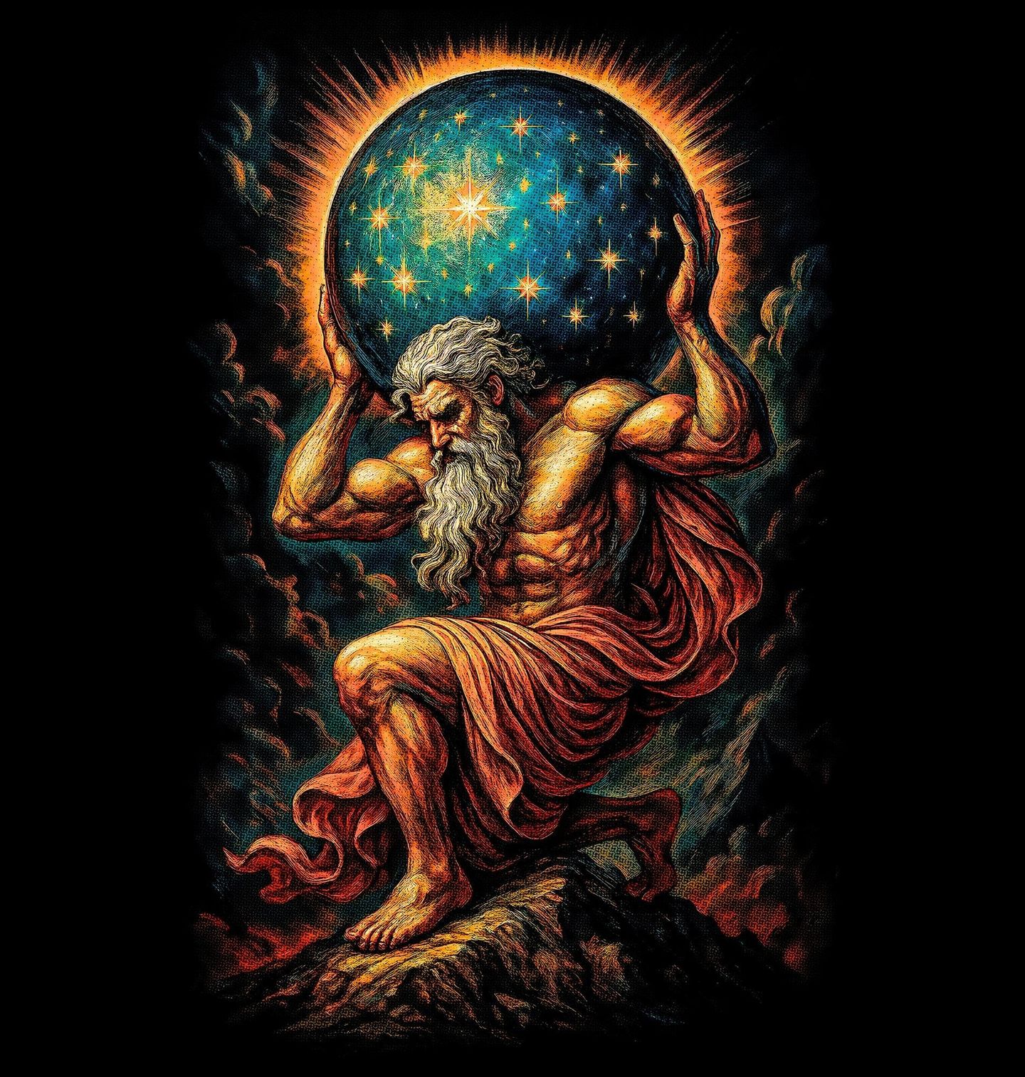 Dámské tričko Atlas Tíha Světa na Ramenou. Atlás je v řecké mytologii mocný Titán, syn Íapeta a Klymené, kterého Zeus za trest po prohrané válce (Titanomachii) odsoudil k věčnému nesení nebeské klenby na ramenou. Působí jako symbol vytrvalosti, síly a břemene na západním okraji světa. Design inspirovaný tématem řecká mytologie zachycuje dramatickou energii, moc a nadčasovou symboliku.