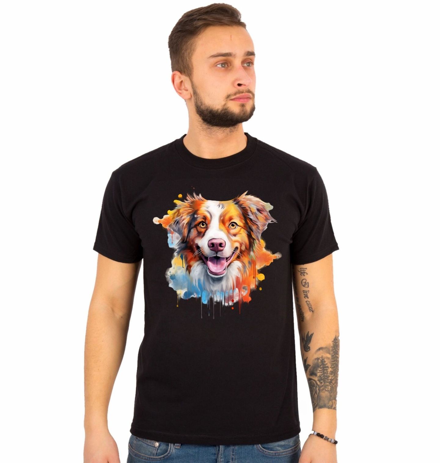 Pánské tričko Australský ovčák Red merle. Australský ovčák je červeno-hnědý mramorovaný pes plný života, věrnosti a inteligence – a přesně to vystihuje i tento originální potisk. Triko je ideální dárek pro každého milovníka plemene Australský ovčák i pro každého pejskaře, který ví, že pes je víc než jen zvíře – je to člen rodiny.
