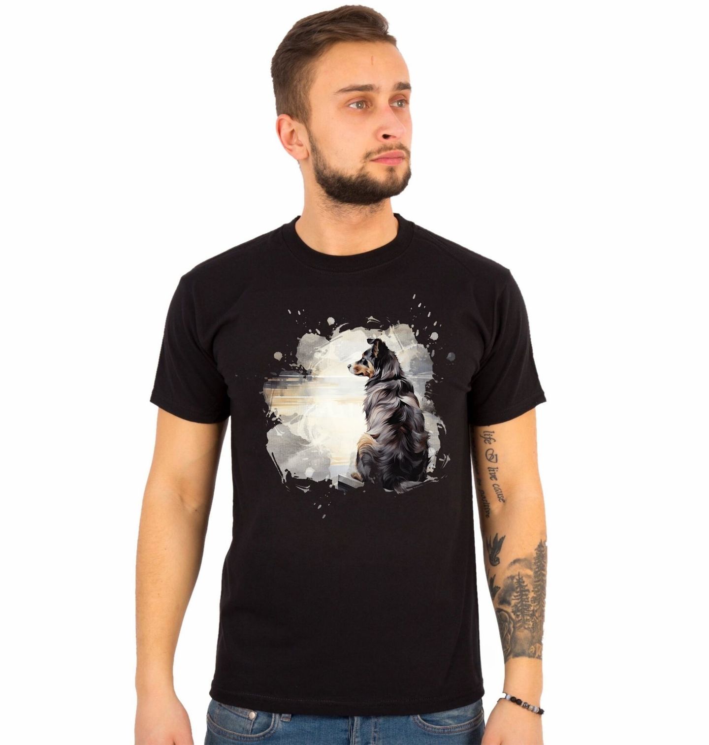 Pánské tričko Australský ovčák u Jezera. Zažijte kouzlo klidného rána s tímto jedinečným motivem na tričku, na kterém pes Australský ovčák sedí a tiše pozoruje odraz nebe na hladině jezera. Motiv působí meditativně a citlivě zachycuje chvíle, které každý opravdový pejskař dobře zná – ticho, blízkost a souznění s přírodou i se psem.