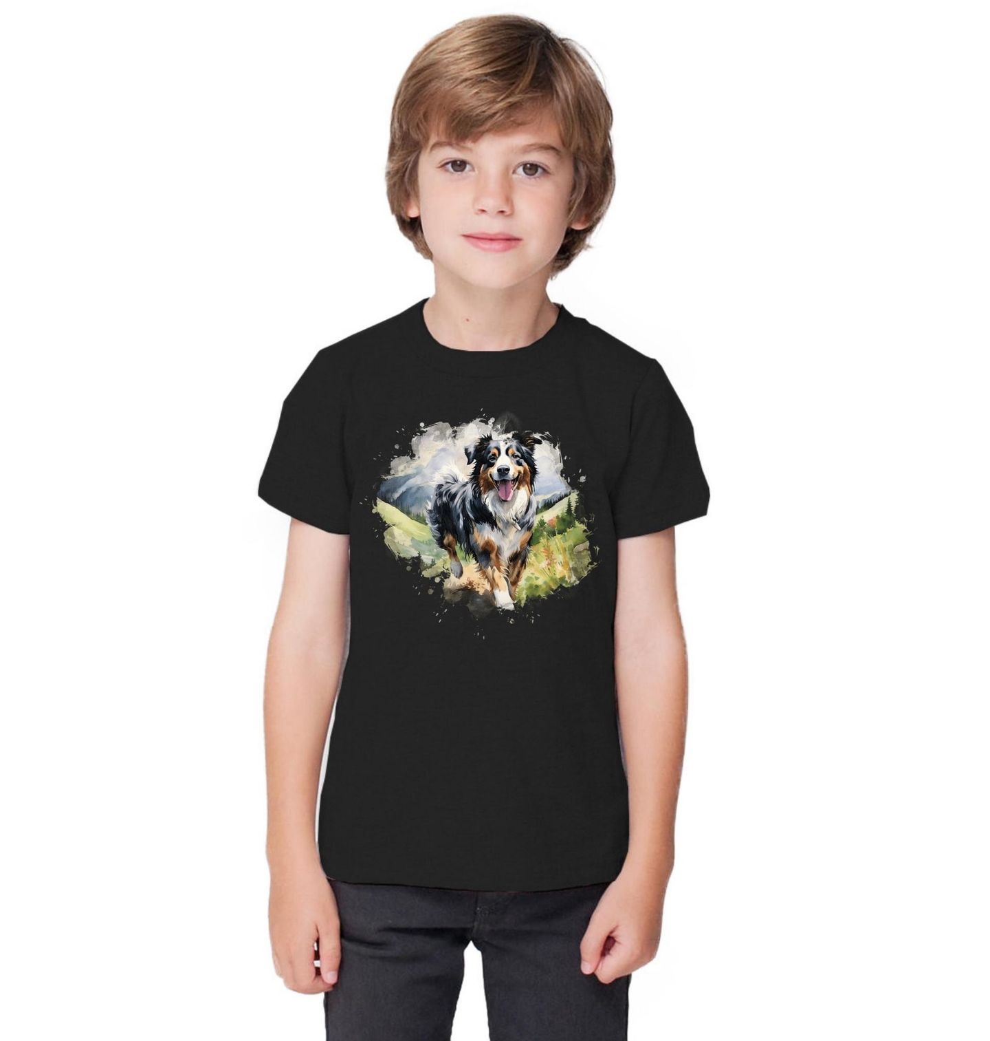 Dětské tričko Australský ovčák v Horách. Vdechněte svému outfitu energii a svobodu, kterou představuje pes Australský ovčák v pohybu! Tento originální motiv na tričku zachycuje radost, volnost a přirozený temperament tohoto chytrého a oddaného plemene. Ideální pro každého, kdo miluje psy, hory a aktivní styl života.