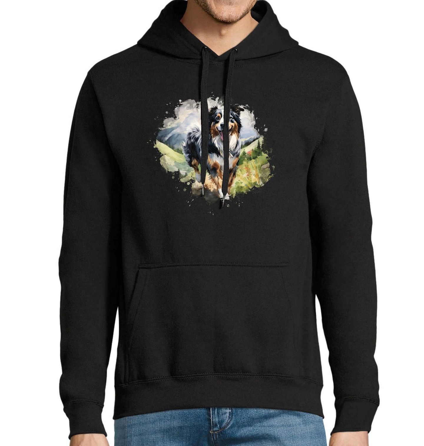Pánská mikina Australský ovčák v Horách. Vdechněte svému outfitu energii a svobodu, kterou představuje pes Australský ovčák v pohybu! Tento originální motiv na tričku zachycuje radost, volnost a přirozený temperament tohoto chytrého a oddaného plemene. Ideální pro každého, kdo miluje psy, hory a aktivní styl života.