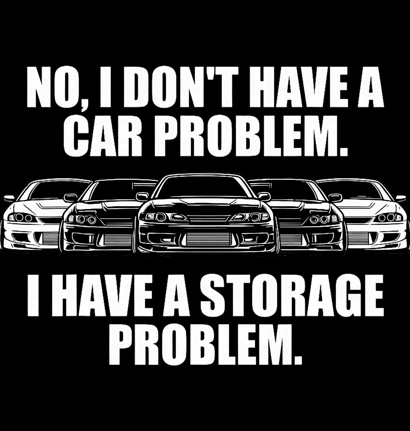 Pánské tričko Aut Není Nikdy Dost. Minimalistický, ale výstižný design s řadou sportovních aut a humorným textem. Překlad „No, I don’t have a car problem. I have a storage problem.“ zní „Ne, nemám problém s auty. Mám problém s úložištěm.“ Ideální pro každého, kdo sbírá auta a potřebuje víc prostoru.