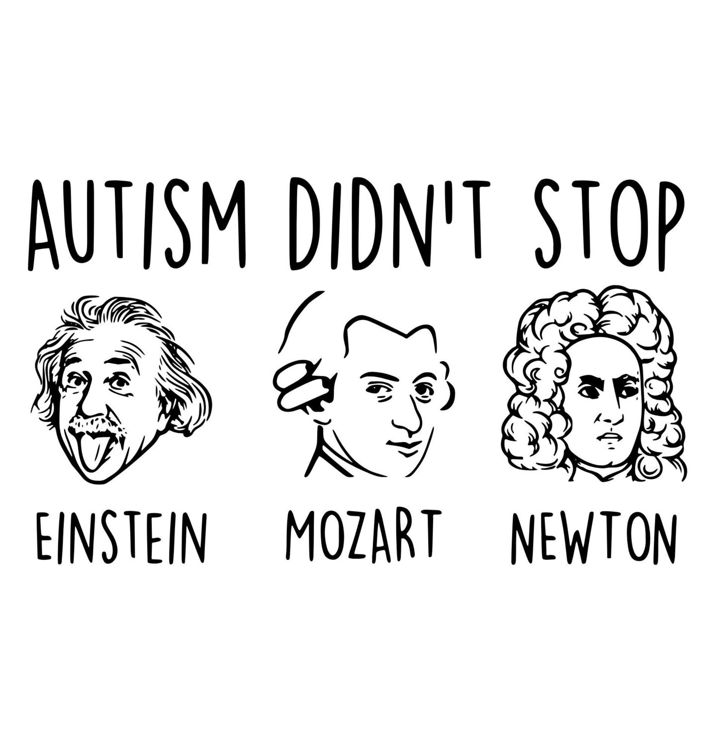 Dámské tričko Autismus není Překážkou. Motiv s textem „Autism didn’t stop“ (Autismus je nezastavil). Zobrazuje génie Einsteina, Mozarta a Newtona jako inspiraci. Design autismus podporuje respekt a pochopení.