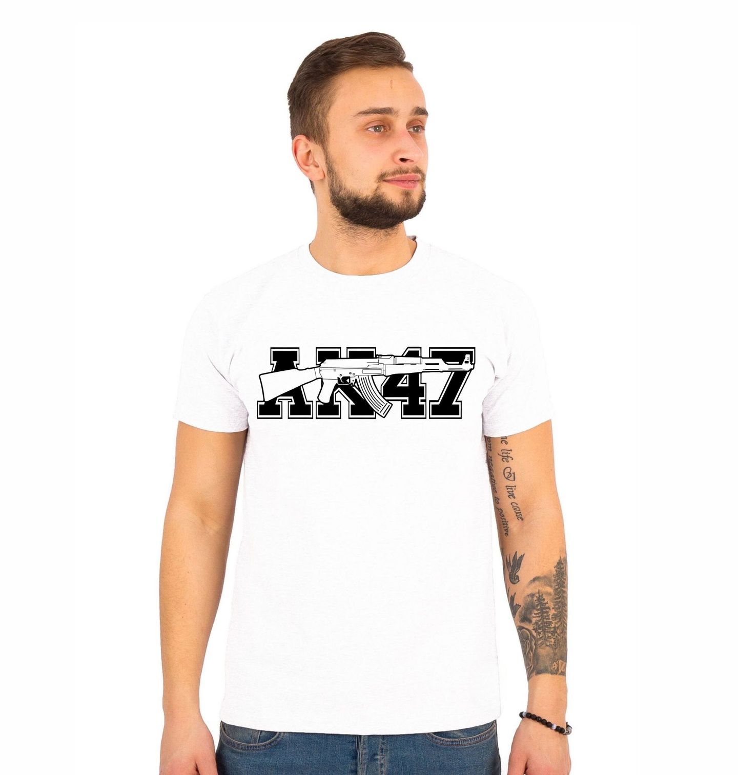 Pánské tričko Automatická Puška AK-47. Grafický design s výrazným nápisem AK47 doplněný ilustrací zbraně v minimalistickém stylu. Silný kontrast černé a bílé dodává motivu drsný a výrazný charakter. Vhodné pro fanoušky military stylu, grafického designu a streetwear módy. Pro všechny milovníky videohry Counter-Strike.