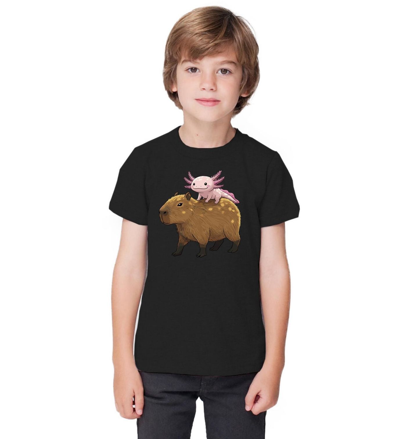 Dětské tričko Axolotl Jízda na Kapybaře. Roztomilý a pozitivní motiv, na kterém se setkává klidná kapybara a usměvavý růžový axolotl. Kapybara je největší hlodavec na světě a je známá svým přátelským a pohodovým vystupováním — a právě proto si s axolotlem vytváří dokonalé parťáctví plné klidu a dobré nálady.