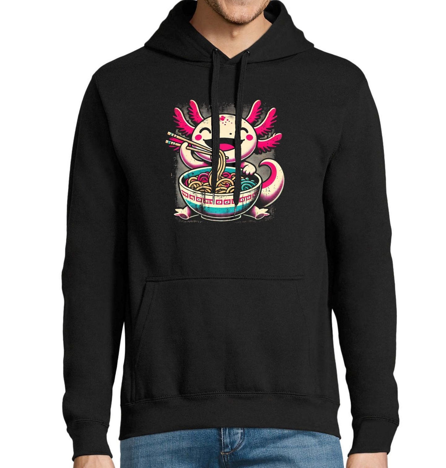 Pánská mikina Axolotl mexický a Ramen. Stylový potisk zachycuje veselého axolotla, který si s nadšením pochutnává na misce lahodného ramenu pomocí hůlek. Ideální pro milovníky japonské kuchyně, street food kultury a fanoušky těchto unikátních vodních tvorů. Skvělé na každodenní nošení, na festival, do města nebo jako originální dárek pro každého, kdo má rád ramen i axolotly.