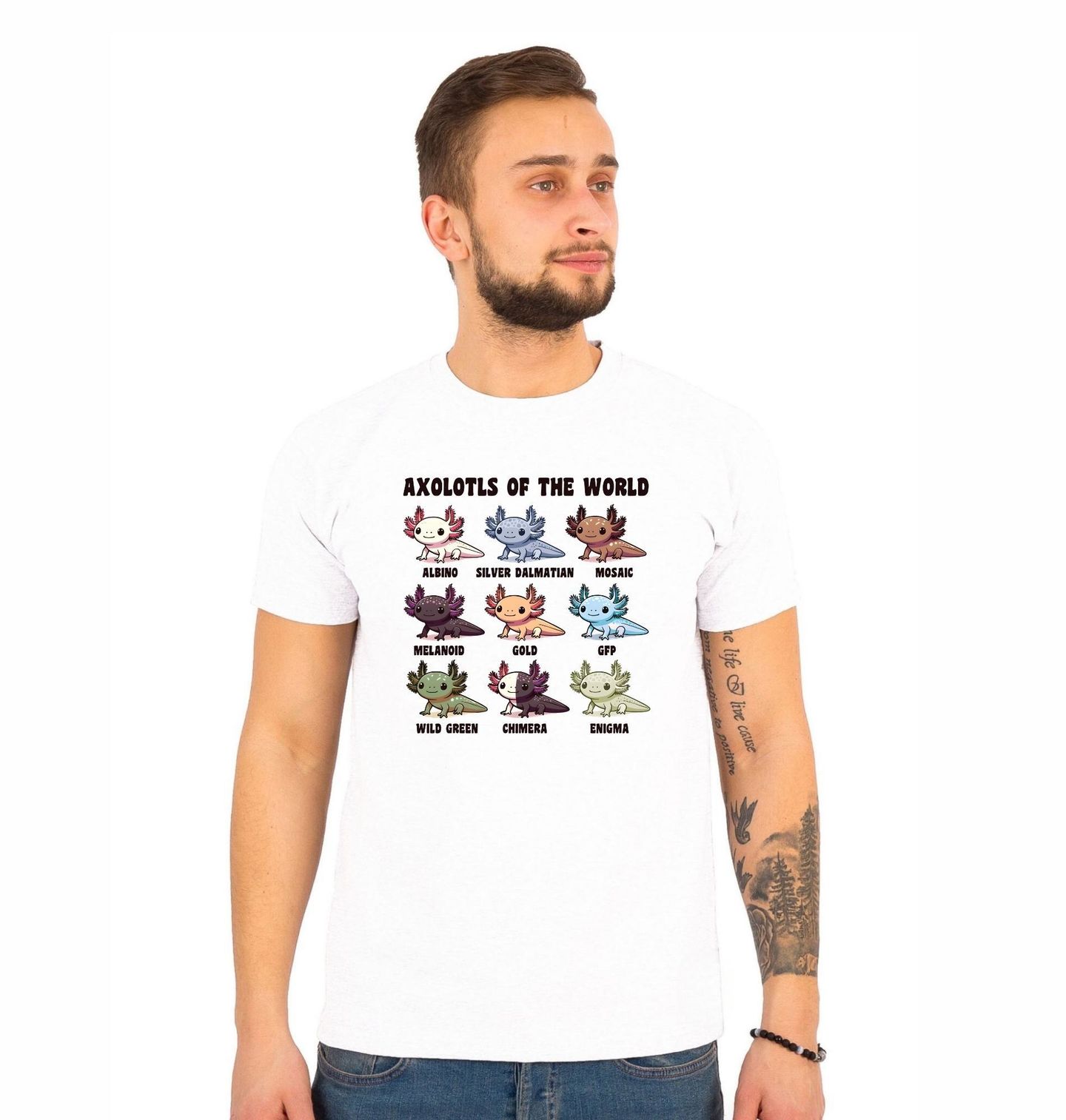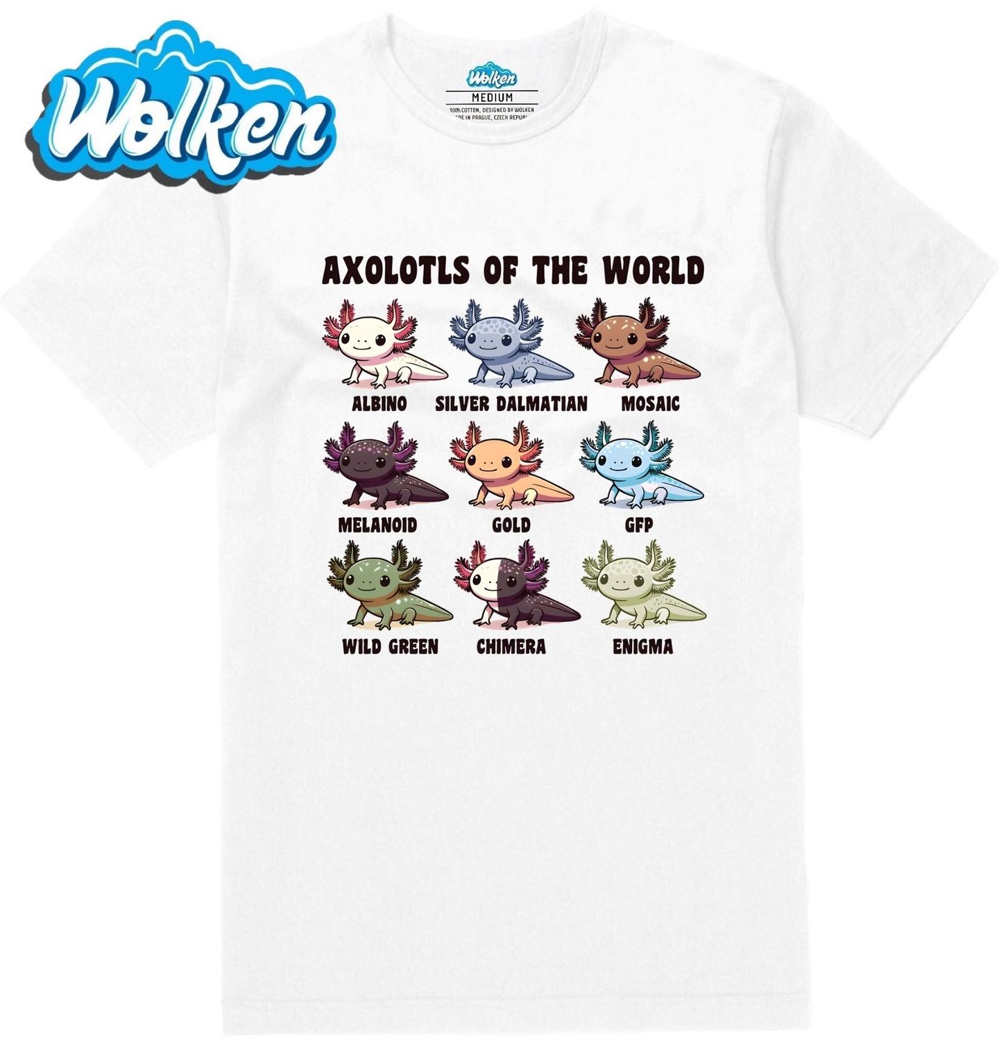 Pánské tričko Axolotlové z celého světa. Design představuje devět oblíbených variant, které axolotl může mít: Albino, Silver Dalmatian, Mosaic, Melanoid, Gold, GFP, Wild Green, Chimera a Enigma. Každý axolotl má svůj originální vzhled a kouzlo, které z něj dělá fascinujícího mazlíčka i symbol jedinečnosti.