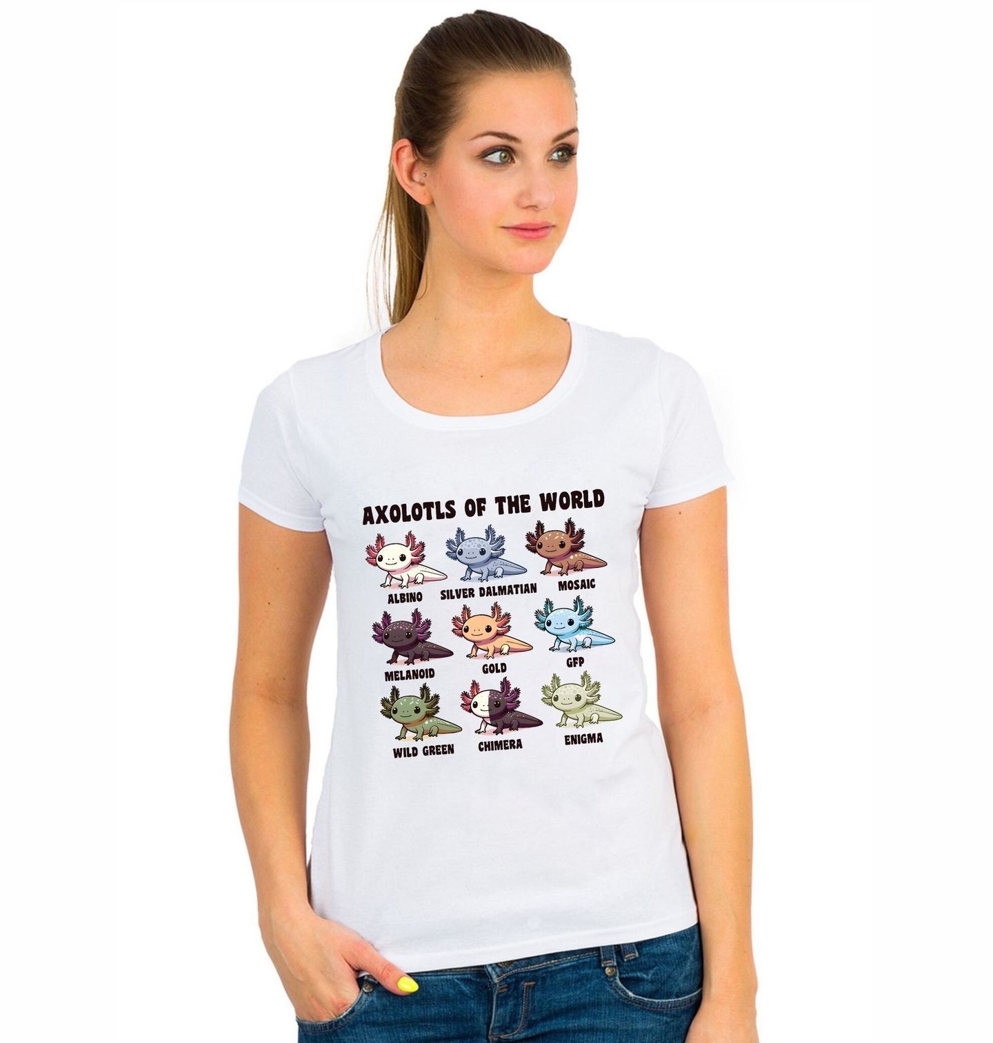 Dámské tričko Axolotlové z celého světa. Design představuje devět oblíbených variant, které axolotl může mít: Albino, Silver Dalmatian, Mosaic, Melanoid, Gold, GFP, Wild Green, Chimera a Enigma. Každý axolotl má svůj originální vzhled a kouzlo, které z něj dělá fascinujícího mazlíčka i symbol jedinečnosti.