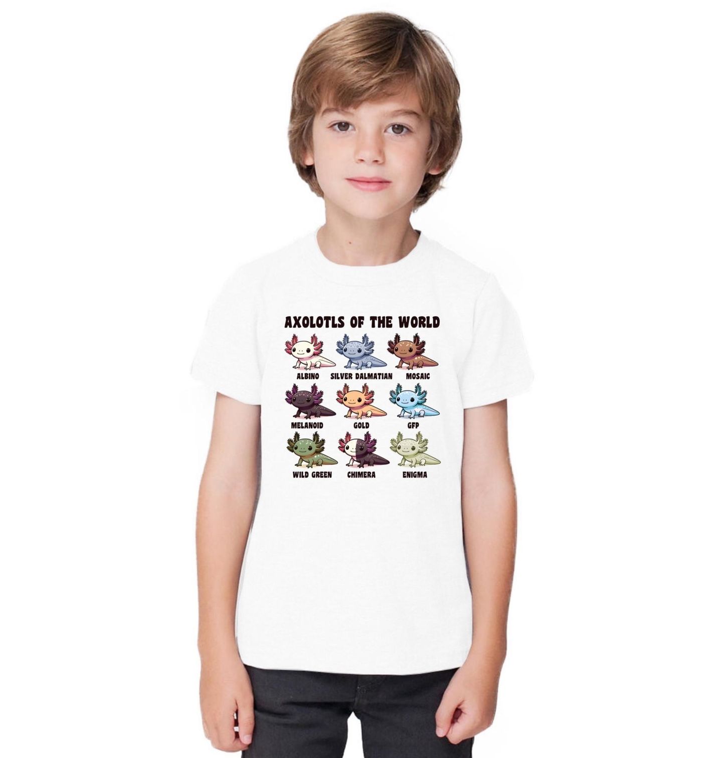 Dětské tričko Axolotlové z celého světa. Design představuje devět oblíbených variant, které axolotl může mít: Albino, Silver Dalmatian, Mosaic, Melanoid, Gold, GFP, Wild Green, Chimera a Enigma. Každý axolotl má svůj originální vzhled a kouzlo, které z něj dělá fascinujícího mazlíčka i symbol jedinečnosti.