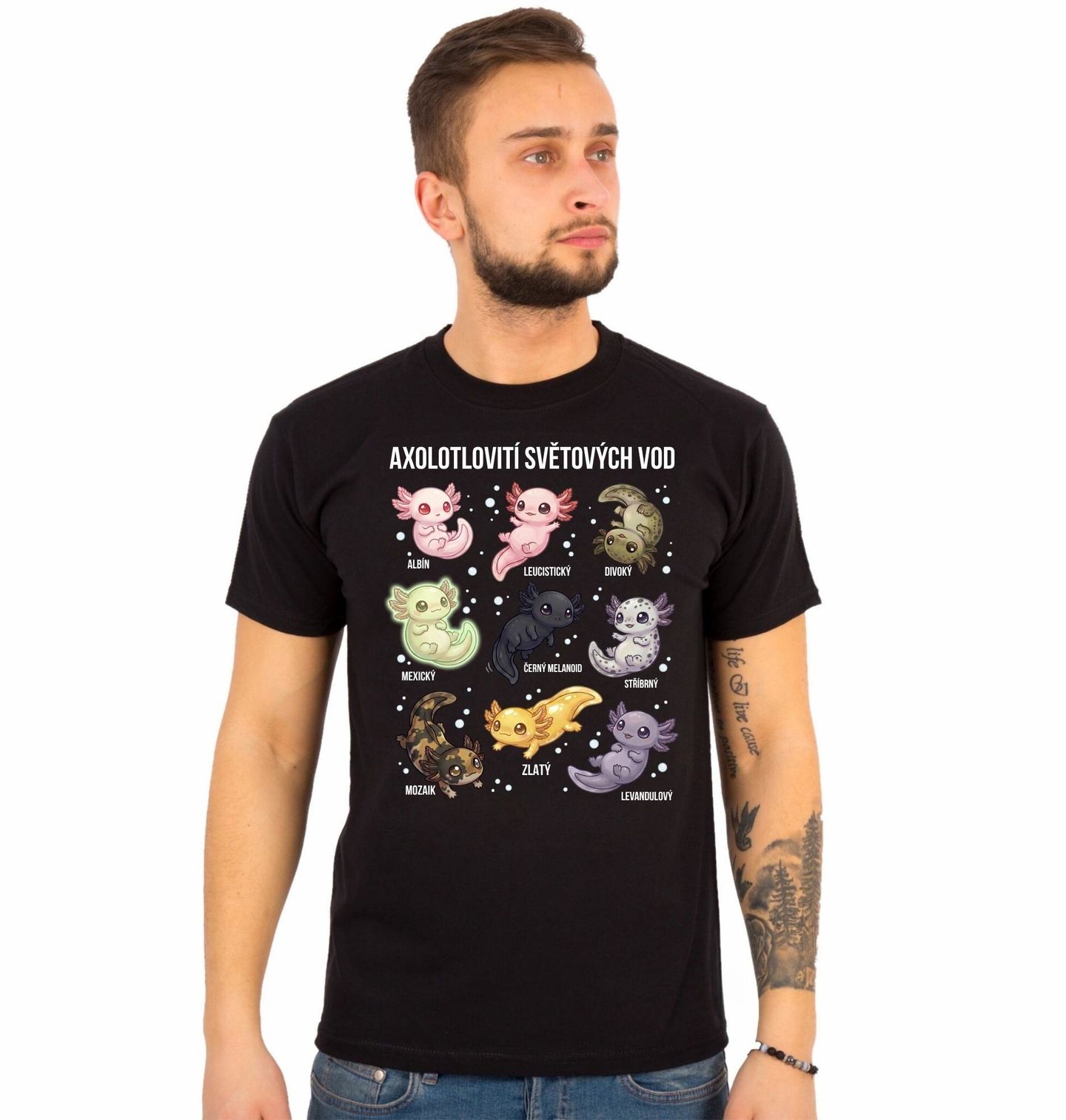 Pánské tričko Axolotlovití světových vod. Axolotl mexický, česky také zvaný vodní dráček, chodící mlok nebo tygří mlok, je středně velký obojživelník vyskytující se v mexických jezerech Lago de Xochimilco. Na motivu najdeš tyto druhy, které může axolotl mít: albín, leucistický, divoký, mexický, černý melanoid, stříbrný, mozaik, zlatý a levandulový. Každý axolotl má svůj vlastní vzhled a charakter, což z tohoto motivu dělá skvělý kousek pro milovníky přírody i netradičních ilustrací.