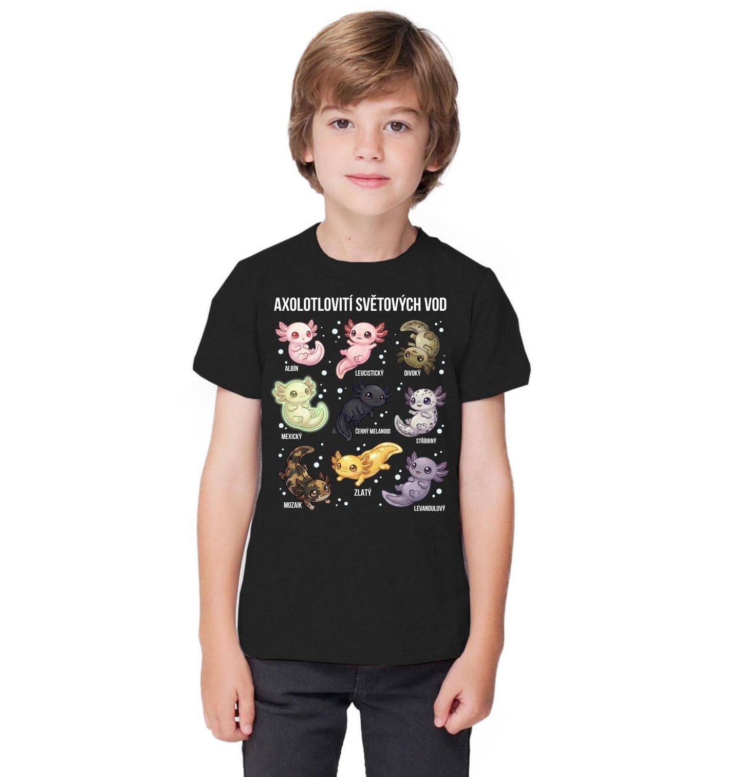 Dětské tričko Axolotlovití světových vod. Axolotl mexický, česky také zvaný vodní dráček, chodící mlok nebo tygří mlok, je středně velký obojživelník vyskytující se v mexických jezerech Lago de Xochimilco. Na motivu najdeš tyto druhy, které může axolotl mít: albín, leucistický, divoký, mexický, černý melanoid, stříbrný, mozaik, zlatý a levandulový. Každý axolotl má svůj vlastní vzhled a charakter, což z tohoto motivu dělá skvělý kousek pro milovníky přírody i netradičních ilustrací.