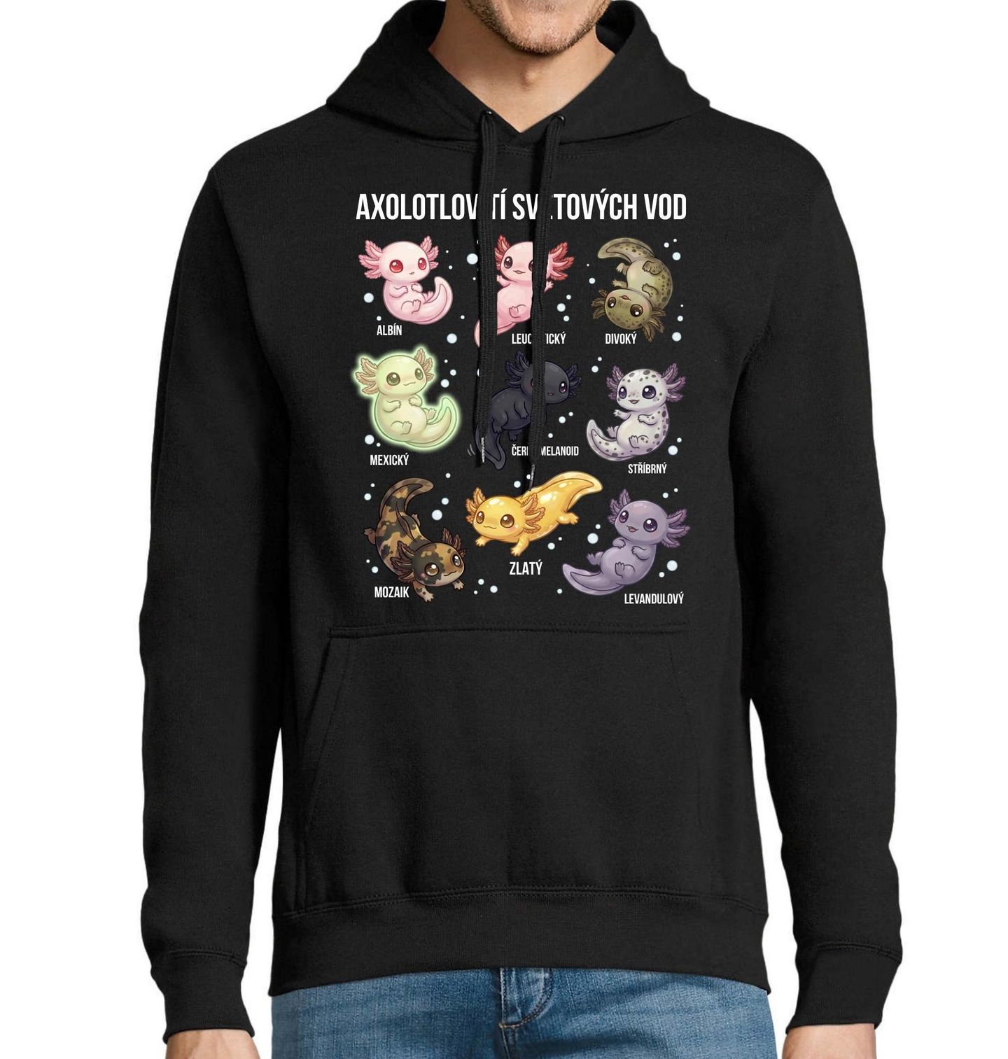 Pánská mikina Axolotlovití světových vod. Axolotl mexický, česky také zvaný vodní dráček, chodící mlok nebo tygří mlok, je středně velký obojživelník vyskytující se v mexických jezerech Lago de Xochimilco. Na motivu najdeš tyto druhy, které může axolotl mít: albín, leucistický, divoký, mexický, černý melanoid, stříbrný, mozaik, zlatý a levandulový. Každý axolotl má svůj vlastní vzhled a charakter, což z tohoto motivu dělá skvělý kousek pro milovníky přírody i netradičních ilustrací.