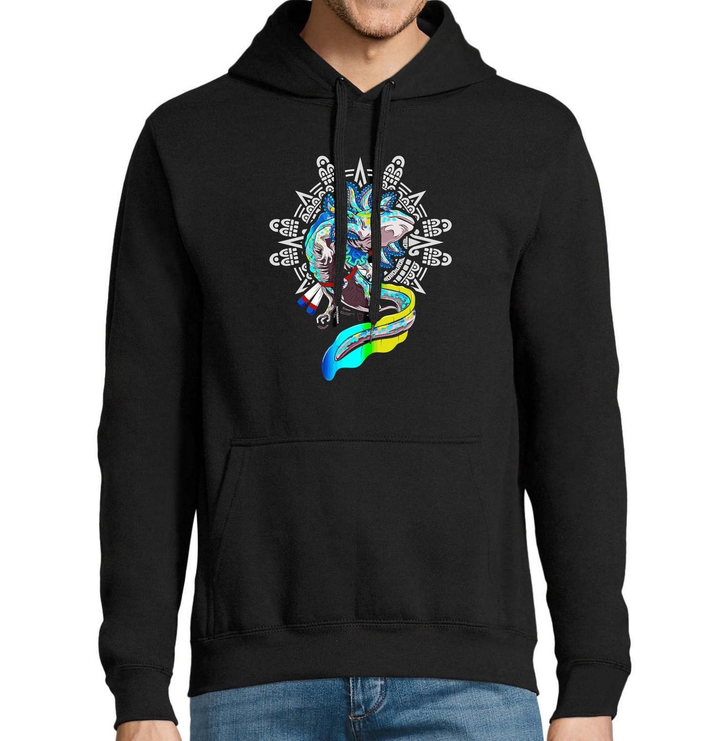 Pánská mikina Aztécký Válečník Axolotl. Axolotl je známý svou schopností regenerace a věčným mládím, což z něj dělá symbol znovuzrození, síly a odolnosti. Motiv v sobě nese prvky aztéckého umění a kultury, ze které axolotl historicky pochází. V aztécké mytologii byl axolotl spojen s bohem Xolotlem a považován za posvátné zvíře.