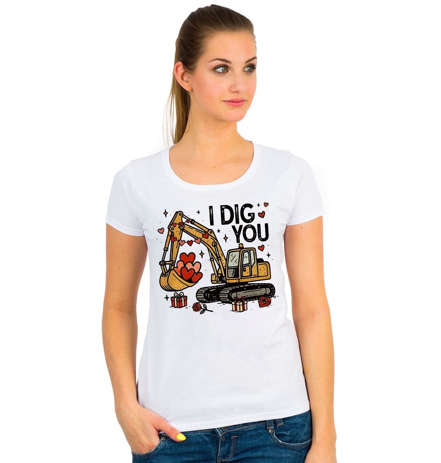 Dámské tričko Bagr Lásky I Dig You. Ilustrace bagru s textem „I dig you“ (Mám tě rád / líbíš se mi) působí vtipně. Srdce v lopatě dodávají designu romantický nádech. Design bagr je perfektní jako originální dárek.