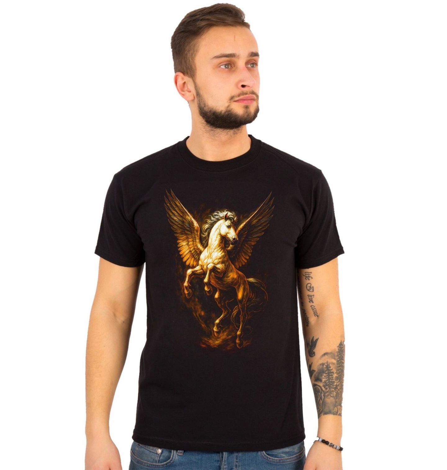 Pánské tričko Bájný Pegasus. Pegas je v řecké mytologii okřídlený kůň, syn boha moří Poseidóna a Medúsy. Řecká mytologie jej popisuje jako okřídleného koně, který se stal symbolem svobody, odvahy a duchovní inspirace. Dynamická kompozice, rozevřená křídla a dramatické zlaté tóny vytvářejí působivý obraz mýtické síly.