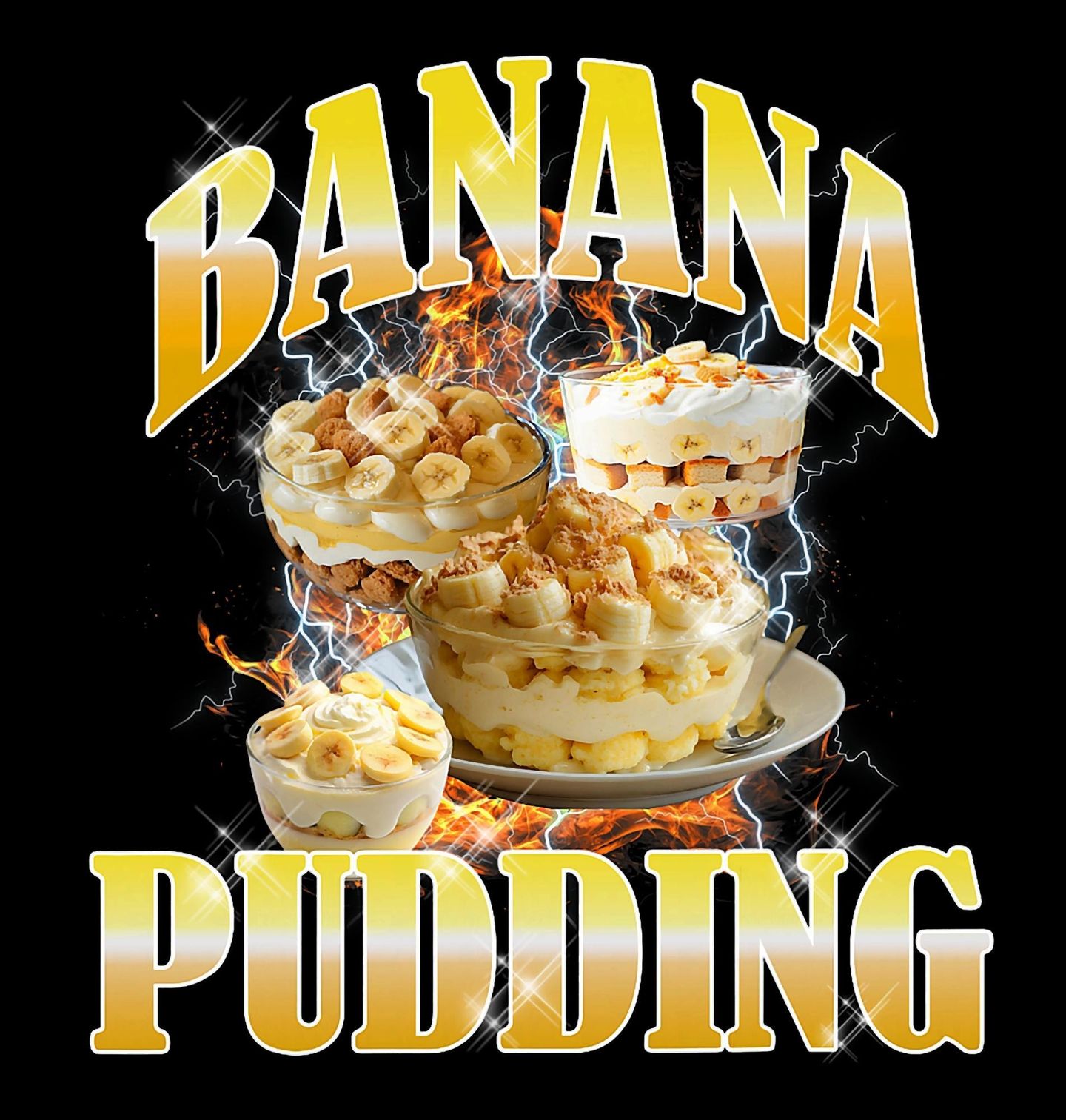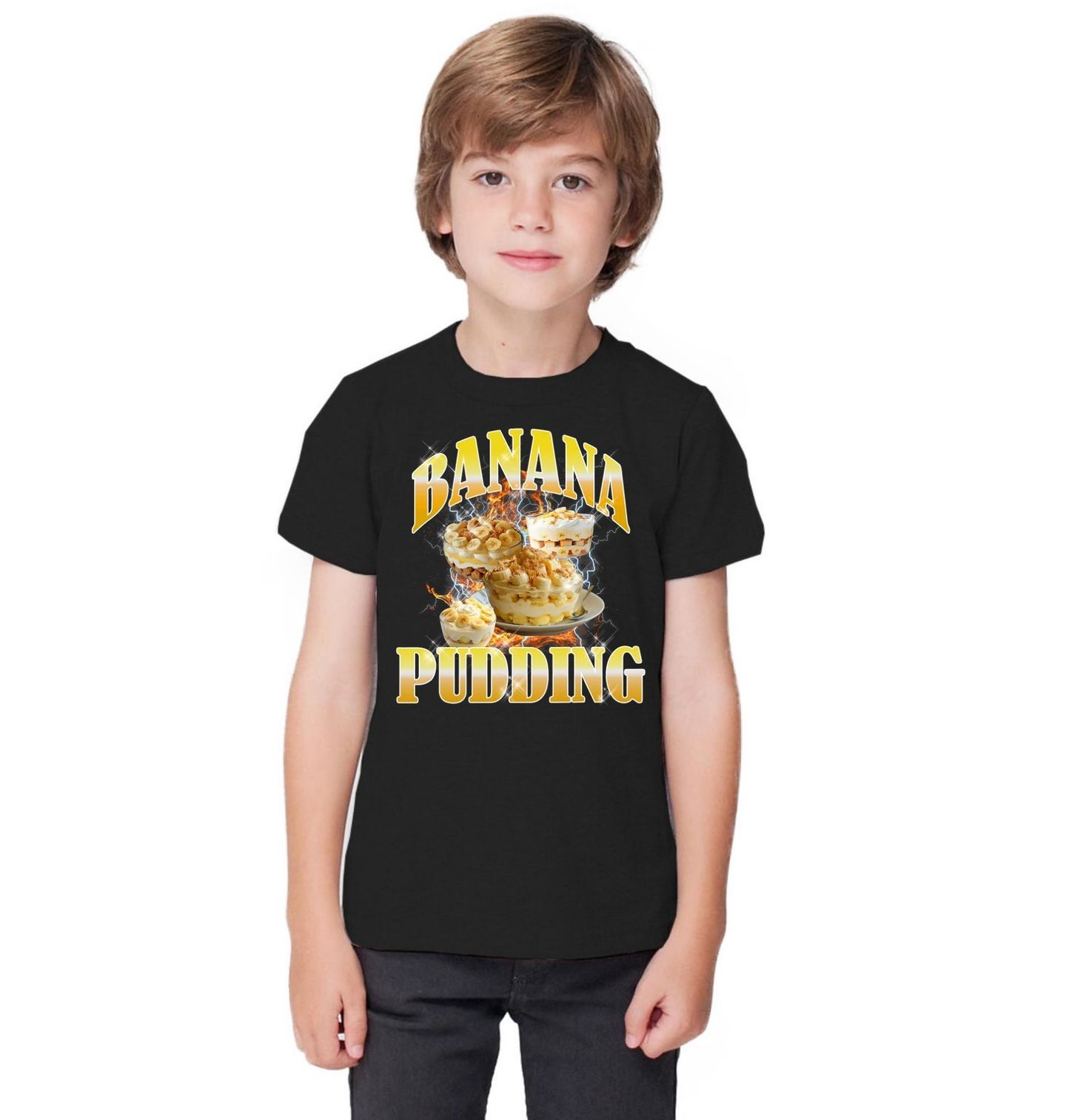 Dětské tričko Banana Pudding Deluxe. Lahodný dezert banana pudding je zobrazen v několika variantách s banány, krémem a sušenkami. Text „Banana Pudding“ znamená „banánový pudink“ a zdůrazňuje sladkou chuť tohoto oblíbeného dezertu. Perfektní motiv pro milovníky sladkostí a gastronomie.