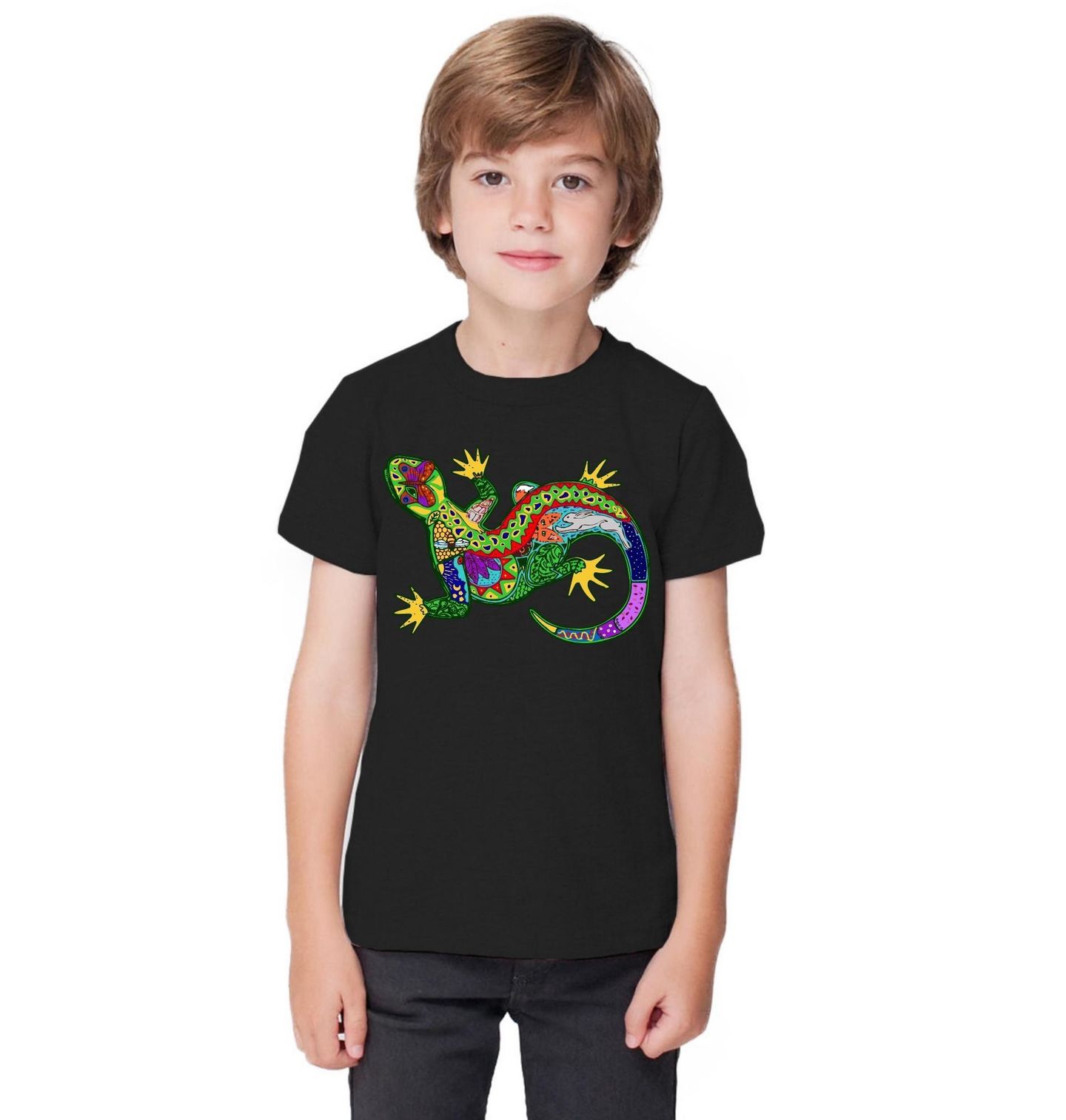 Dětské tričko Barevná Exotická Ještěrka. Výrazný motiv zobrazuje ještěrku jako exotický plaz v bohatých, sytých barvách a hravém stylu. Ještěrka jako plaz je symbolem adaptability, vitality a spojení s přírodou. Tento motiv potěší fanoušky exotických zvířat, barevných ilustrací i teraristiky.