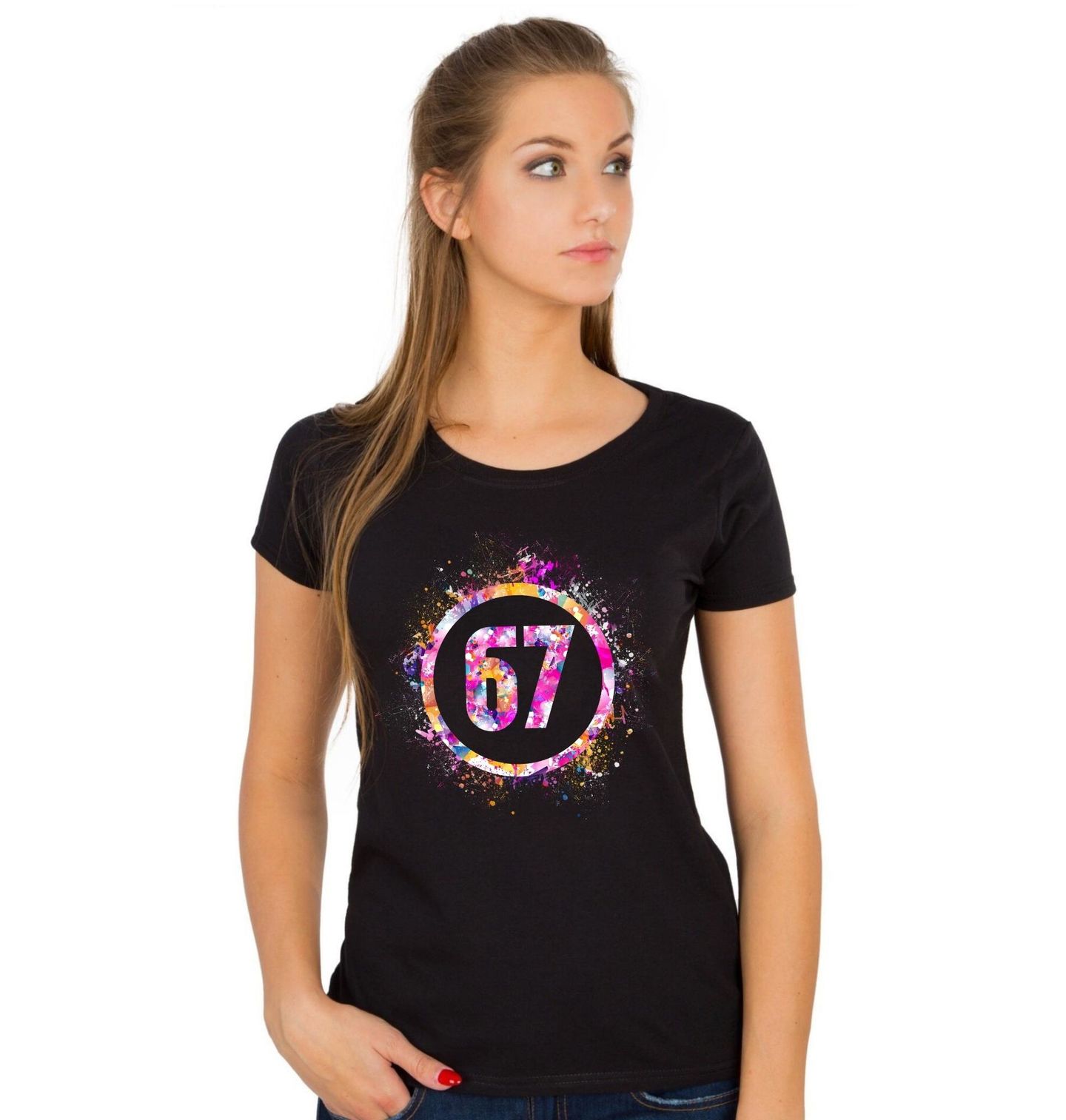 Dámské tričko Barevná Exploze 67 Six Seven Meme. Na motivu je velké číslo 67 uprostřed kruhu. Kolem čísla jsou výrazné barevné skvrny a cákance, díky kterým působí celý design moderně a hravě jako meme. Motiv odkazuje také na pojem six seven a je ideální pro všechny fanoušky čísla 67 a výrazné grafiky.