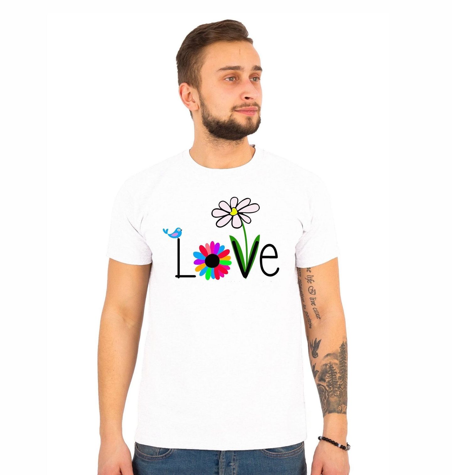 Pánské tričko Barevná Jarní Láska. Motiv se slovem LOVE, neboli Láska, vytvořený z květin a ptáčka působí hravě. Barvy dodávají jarní energii a radost. Design je ideální pro pozitivní náladu.