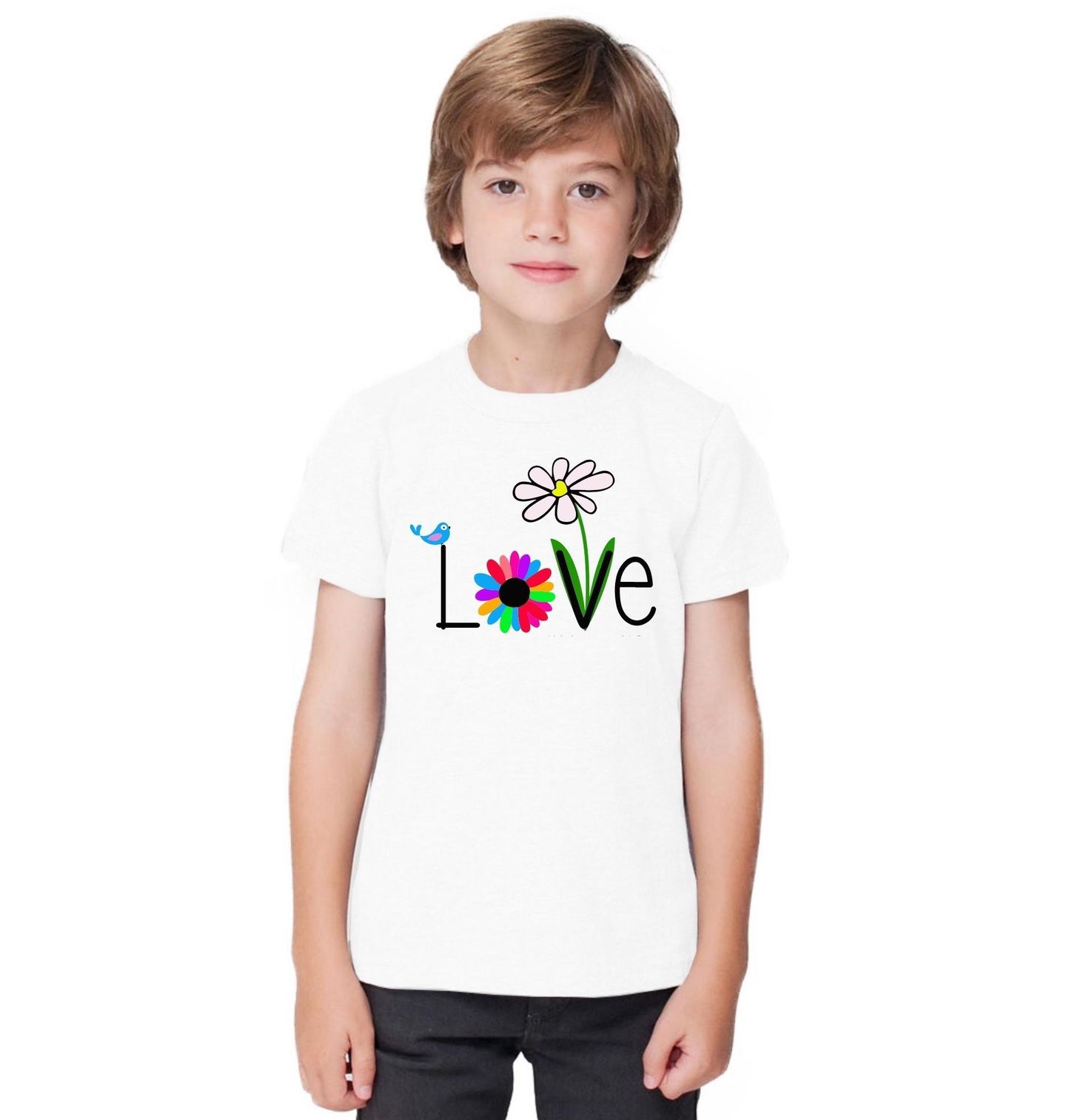 Dětské tričko Barevná Jarní Láska. Motiv se slovem LOVE, neboli Láska, vytvořený z květin a ptáčka působí hravě. Barvy dodávají jarní energii a radost. Design je ideální pro pozitivní náladu.