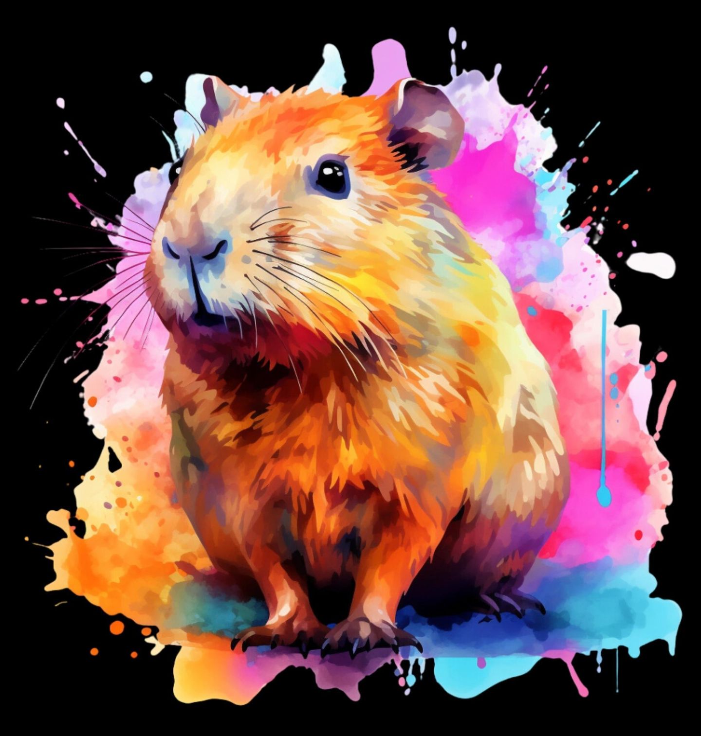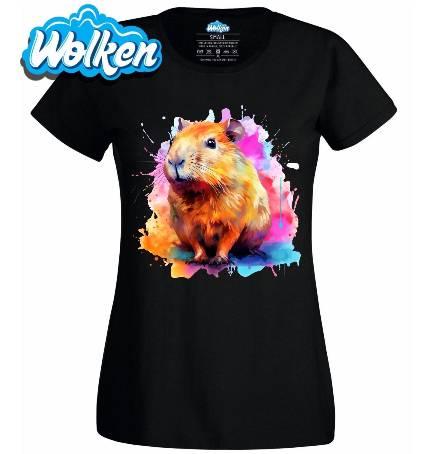 Dámské tričko Barevná Kapybara. Originální motiv zachycuje majestátní zvíře jménem kapybara, největší hlodavec na světě, v explozivním výbuchu barev připomínajícím abstraktní umělecké dílo. Pokud miluješ výrazné designy, zvířata a trochu extravagance, tohle je pro tebe.
