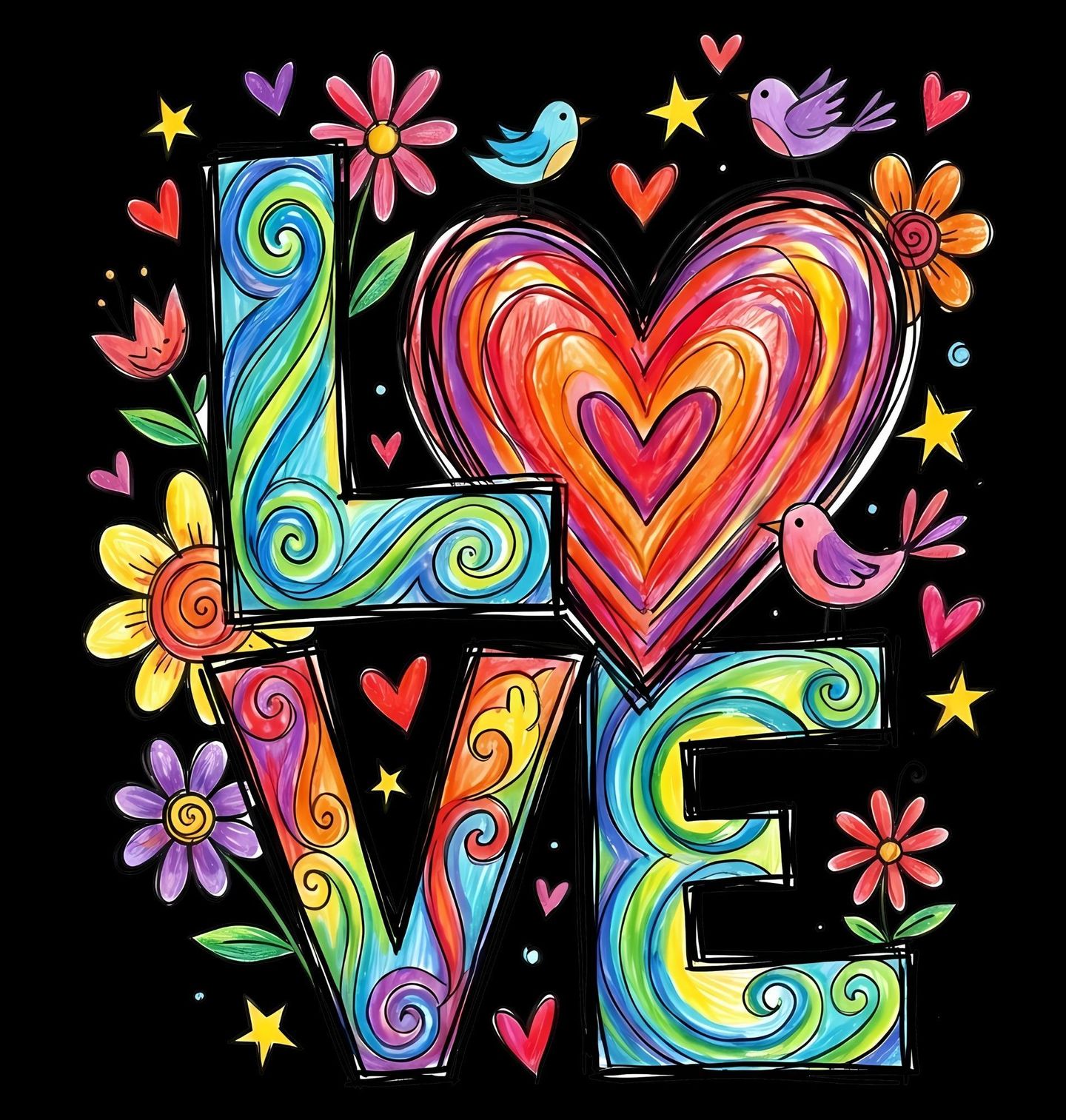 Pánské tričko Barevná Láska LOVE. Tento veselý a barevný motiv s nápisem „LOVE“, kde hlavní roli hraje láska a srdce, je ideální pro všechny romantické duše, snílky a milovníky barevného života. Láska je zde znázorněna hravým srdcem obklopeným květinami, hvězdičkami a ptáčky, takže motiv působí pozitivně, hravě a optimisticky.