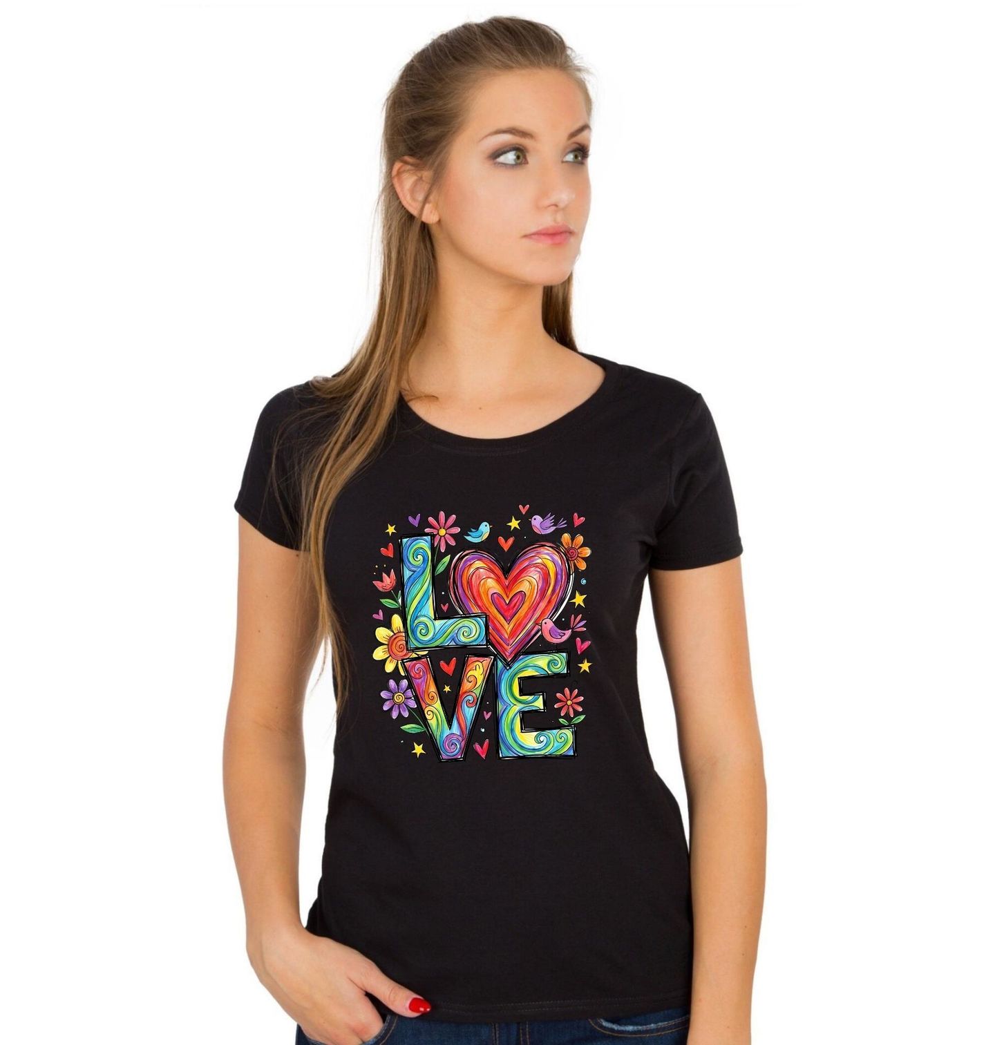Dámské tričko Barevná Láska LOVE. Tento veselý a barevný motiv s nápisem „LOVE“, kde hlavní roli hraje láska a srdce, je ideální pro všechny romantické duše, snílky a milovníky barevného života. Láska je zde znázorněna hravým srdcem obklopeným květinami, hvězdičkami a ptáčky, takže motiv působí pozitivně, hravě a optimisticky.