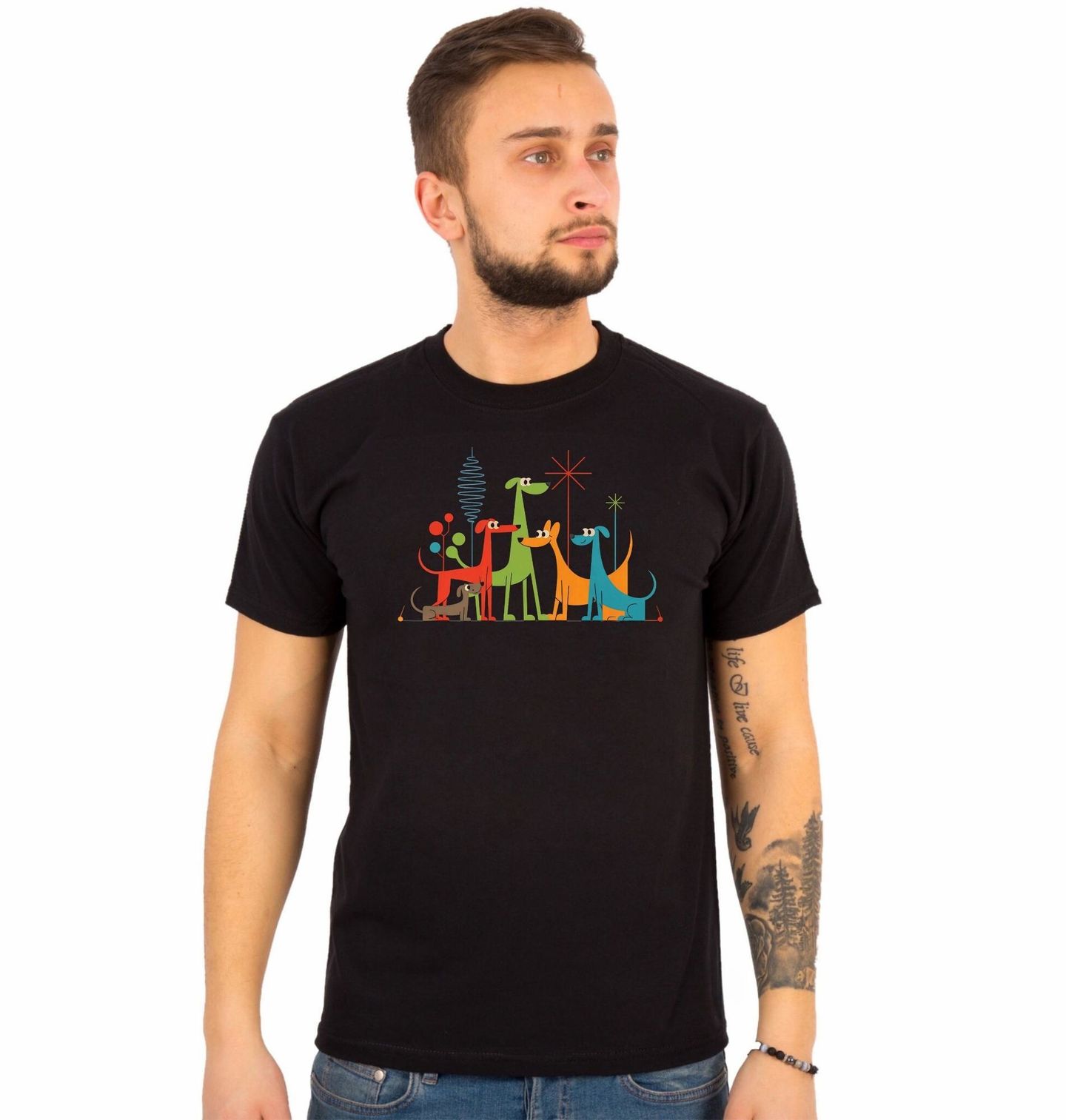 Pánské tričko Barevná Psí Smečka. Veselý a hravý motiv, na kterém je vyobrazen pes chrt (stylově připomínající plemeno jako whippet spolu s dalšími barevnými psy - včetně roztomilého psa jezevčíka. Celá psí parta je zpracována v moderním retro stylu s jednoduchými, ale výraznými barvami. Tenhle design je jako stvořený pro každého milovníka psů - zkrátka pro opravdového pejskař.