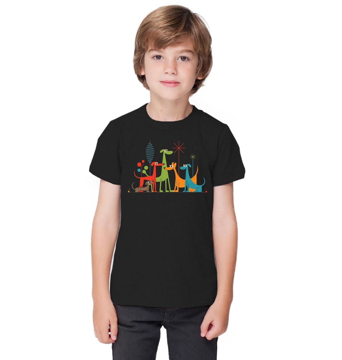Dětské tričko Barevná Psí Smečka. Veselý a hravý motiv, na kterém je vyobrazen pes chrt (stylově připomínající plemeno jako whippet spolu s dalšími barevnými psy - včetně roztomilého psa jezevčíka. Celá psí parta je zpracována v moderním retro stylu s jednoduchými, ale výraznými barvami. Tenhle design je jako stvořený pro každého milovníka psů - zkrátka pro opravdového pejskař.