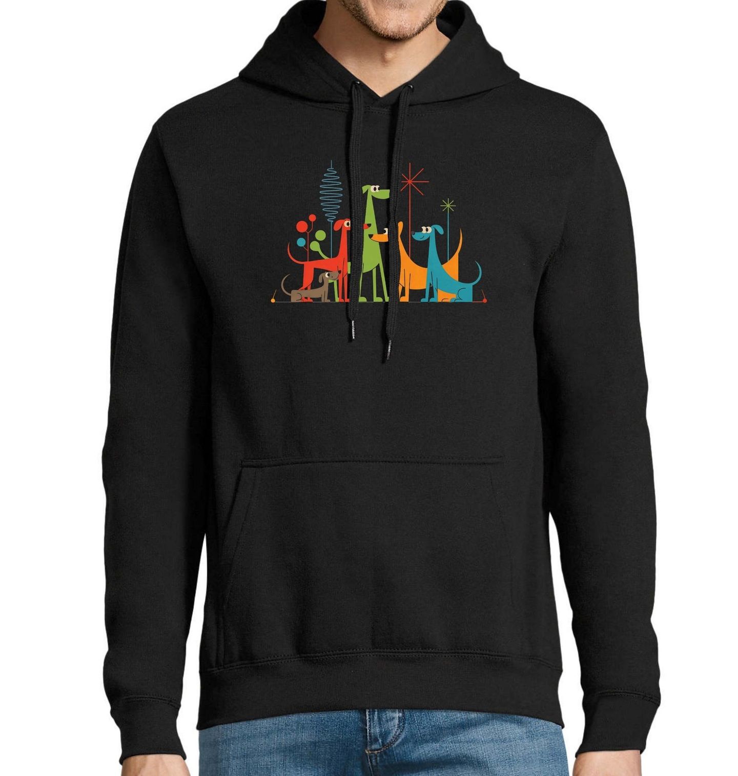 Pánská mikina Barevná Psí Smečka. Veselý a hravý motiv, na kterém je vyobrazen pes chrt (stylově připomínající plemeno jako whippet spolu s dalšími barevnými psy - včetně roztomilého psa jezevčíka. Celá psí parta je zpracována v moderním retro stylu s jednoduchými, ale výraznými barvami. Tenhle design je jako stvořený pro každého milovníka psů - zkrátka pro opravdového pejskař.