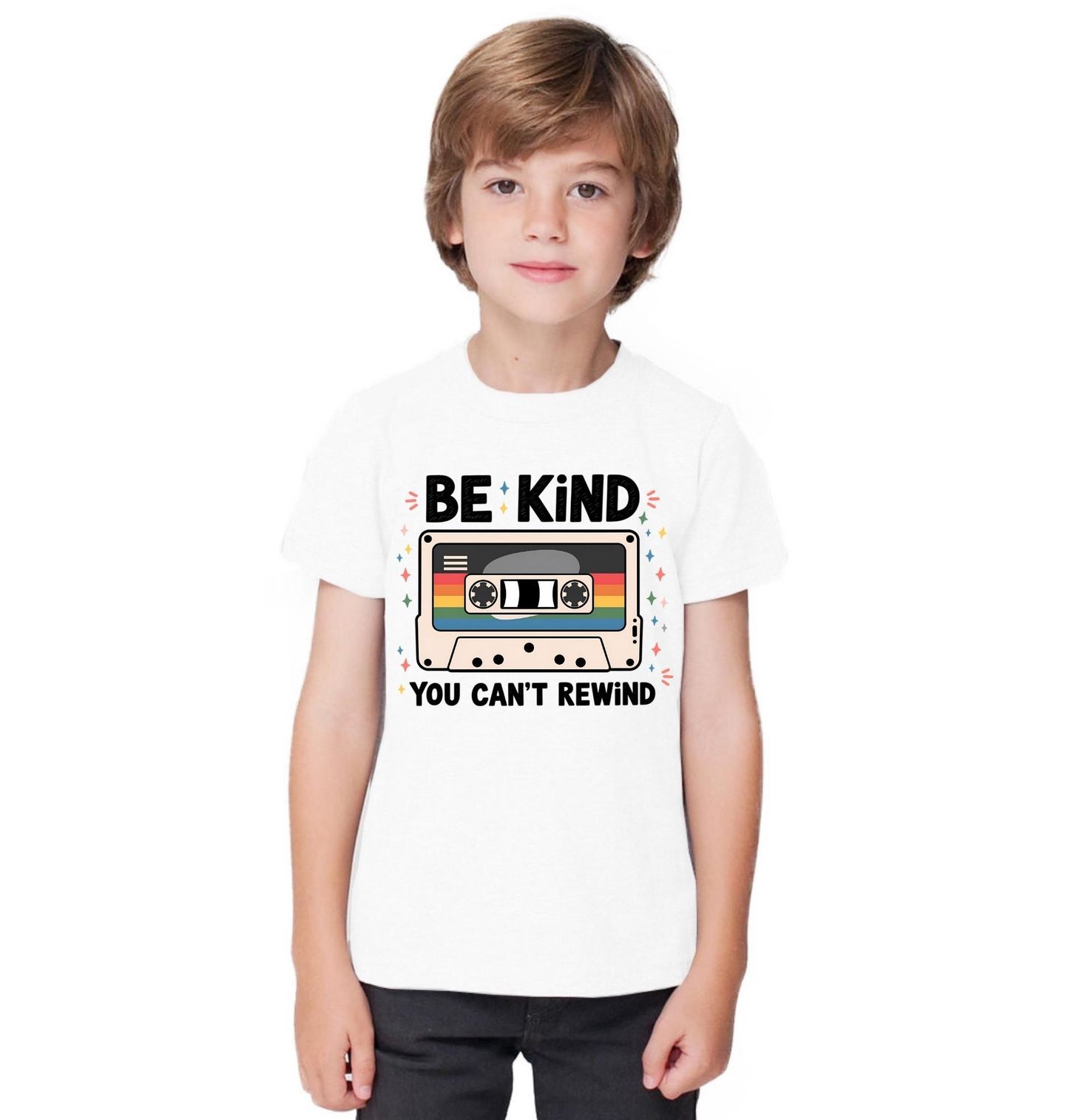 Dětské tričko Barevná Retro Kazeta Be Kind. Stylový motiv zachycuje retro kazetu s barevným designem a pozitivním poselstvím „Be Kind – You Can’t Rewind“, což v překladu znamená „Buď laskavý – nemůžeš to vrátit zpět.“ Tento motiv připomíná, že čas i slova mají svou váhu, a spojuje nostalgii s jednoduchou, ale silnou myšlenkou.