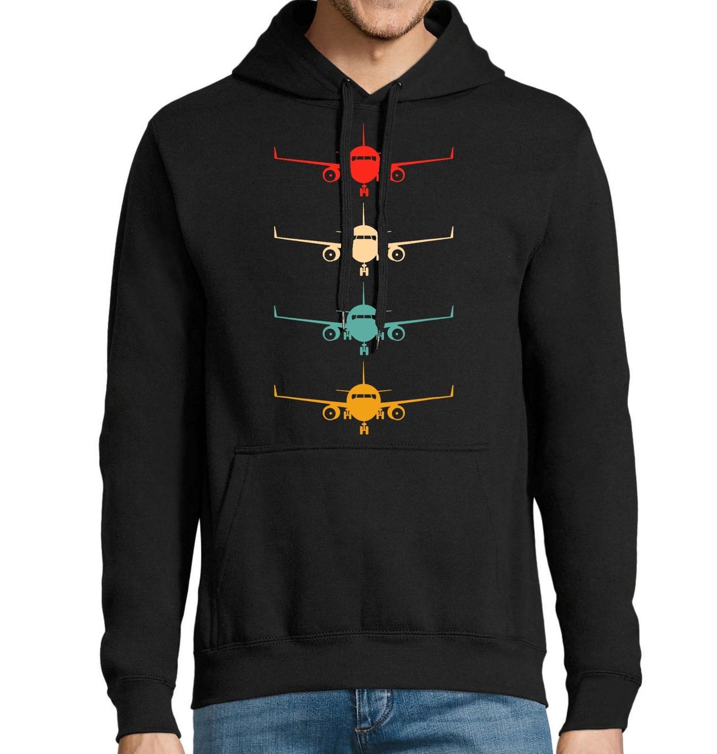 Pánská mikina Barevná Retro Letadla. Stylový motiv s motivem letadla zobrazuje čtyři siluety letadel. Každé letadlo má jinou retro barvu na černém pozadí. Minimalistický design působí moderně a čistě, ideální pro fanoušky letectví a designu.