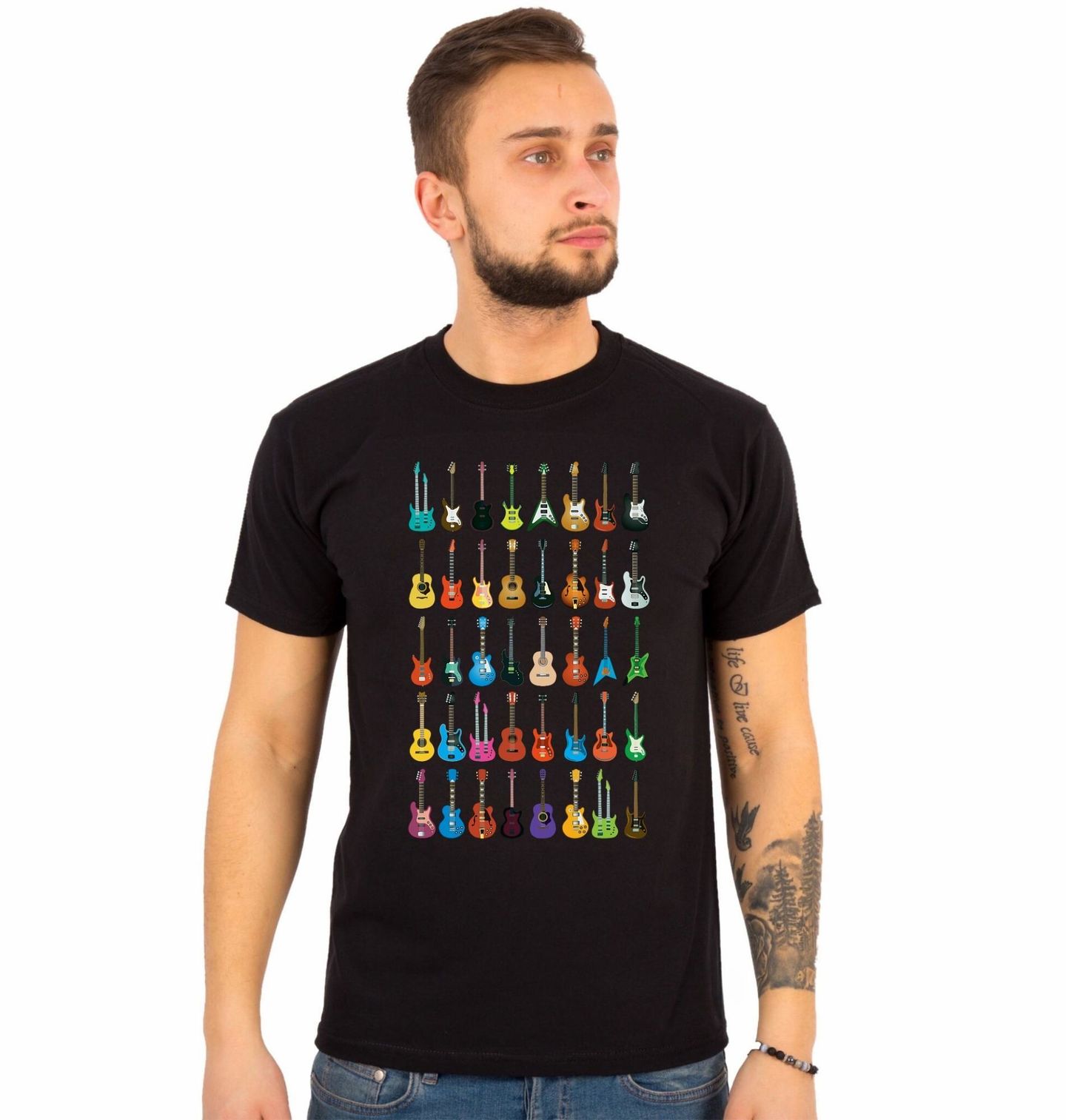 Pánské tričko Barevná Sbírka Kytar. Design zobrazuje desítky různých modelů – od elektrických přes akustické až po netradiční tvary a barevné varianty. Každá kytara má jiný charakter, siluetu i styl, což vytváří působivou galerii hudebních nástrojů na jednom místě. Tento motiv je ideální pro každého, kdo miluje hudbu a pro koho je kytara symbolem kreativity, svobody a osobního vyjádření.