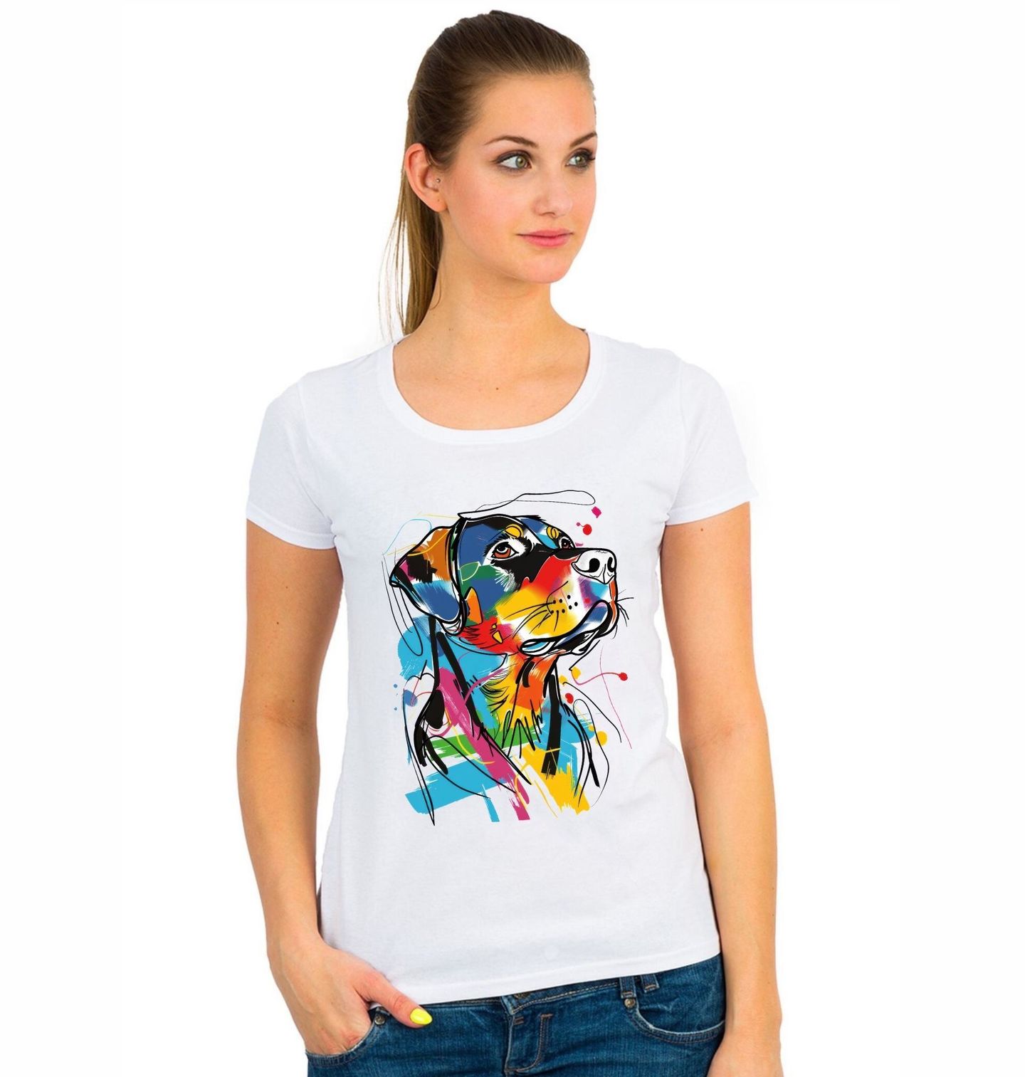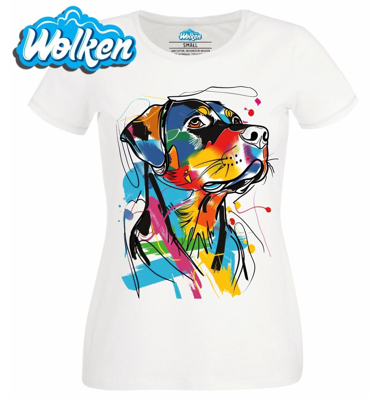 Dámské tričko Barevná skica Rotvajler. Tento stylizovaný pes v urban art stylu zachycuje sílu a eleganci tohoto psa s hravým a moderním nádechem. Perfektní volba pro každého pejskaře, který chce vyjádřit svou lásku ke psům netradičním a uměleckým způsobem.