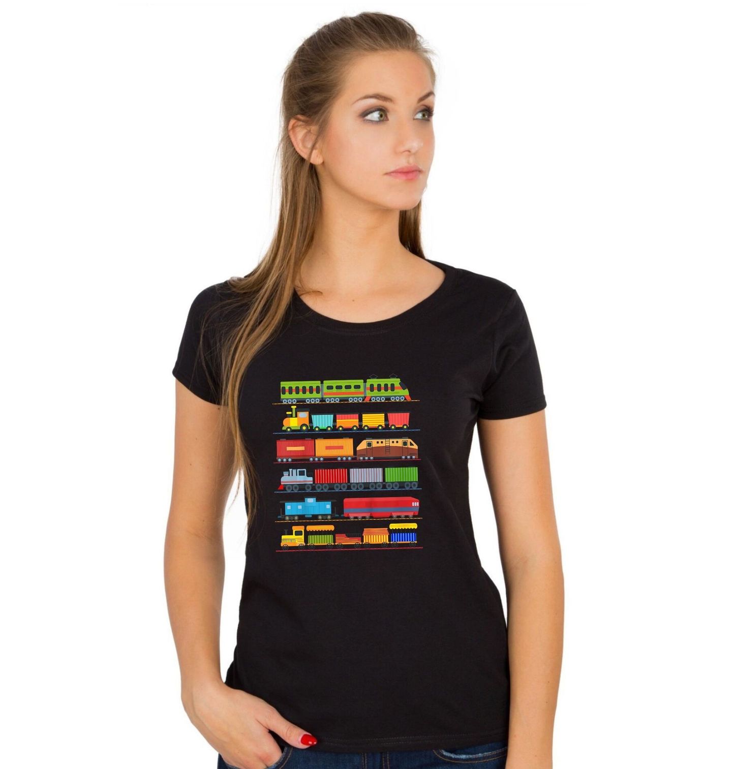 Dámské tričko Barevná Železnice plná Vlaků. Veselý a hravý motiv plný barevných souprav, kde hlavní roli hraje stylová lokomotiva v různých podobách. Ilustrace je laděná do přátelských barev a působí radostně, takže potěší děti, rodiče i všechny fanoušky železnice.