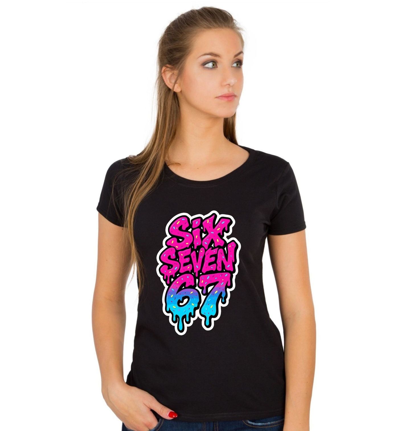 Dámské tričko Barevné Graffiti 67 Six Seven. Stylový a výrazný motiv 67 v podobě barevného graffiti nápisu six seven, který vypadá, jako by z něj kapala poleva nebo barva. Tenhle zábavný a moderní meme design je ideální pro všechny, kdo chtějí originální potisk s pořádnou dávkou streetového stylu.