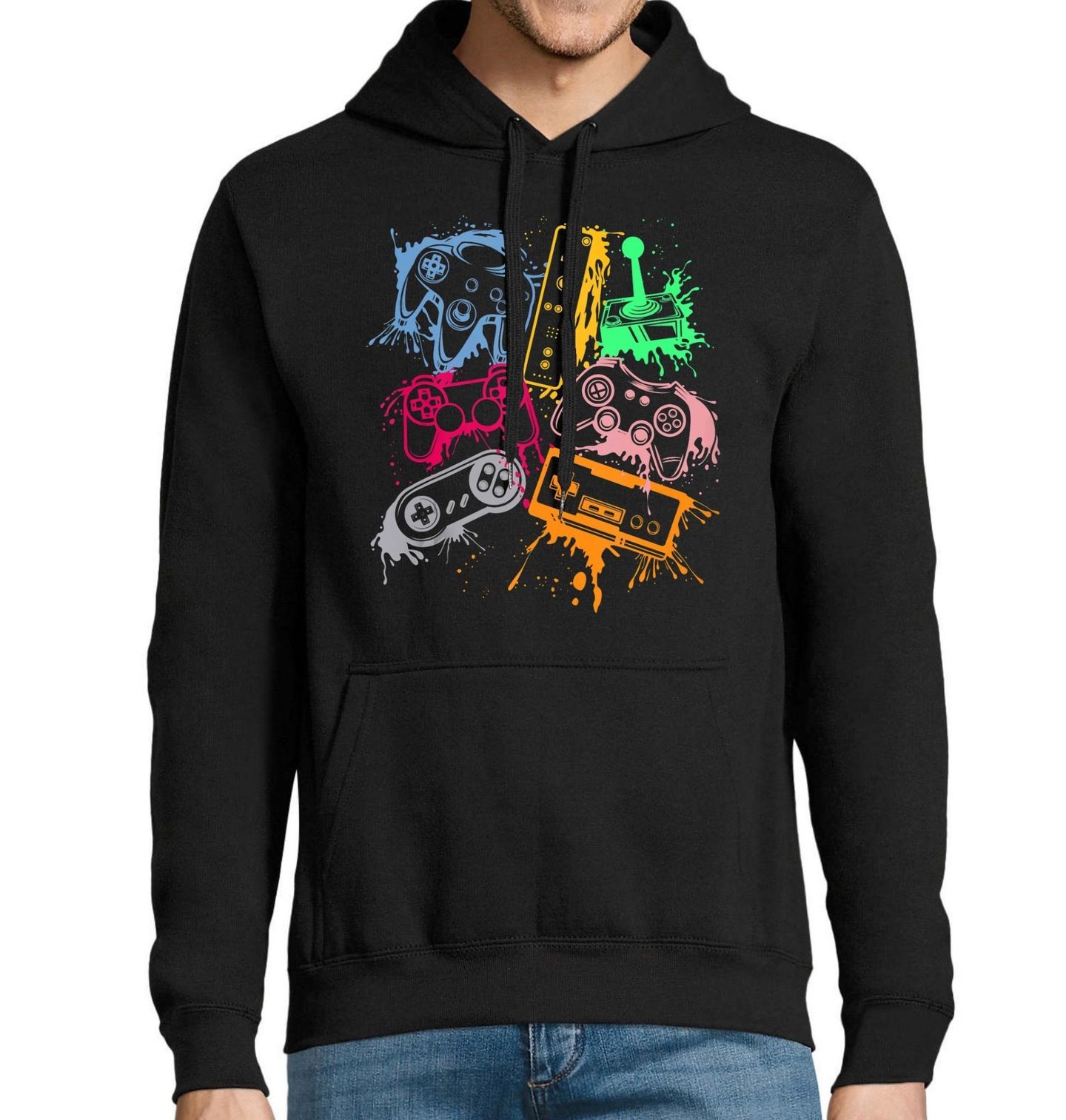 Pánská mikina Barevné Herní Ovladače. Barevný retro motiv plný ikonických herních ovladačů připomíná vývoj videoher od starých konzolí až po moderní gaming. Stylový design se splash efektem je ideální pro každého gamer, který miluje historii her, i pro každého hráč, jenž vyrůstal na klasických joystickách a gamepadech. Grafika kombinuje různé typy ovladačů v dynamickém street-art stylu, takže působí moderně a zároveň nostalgicky.