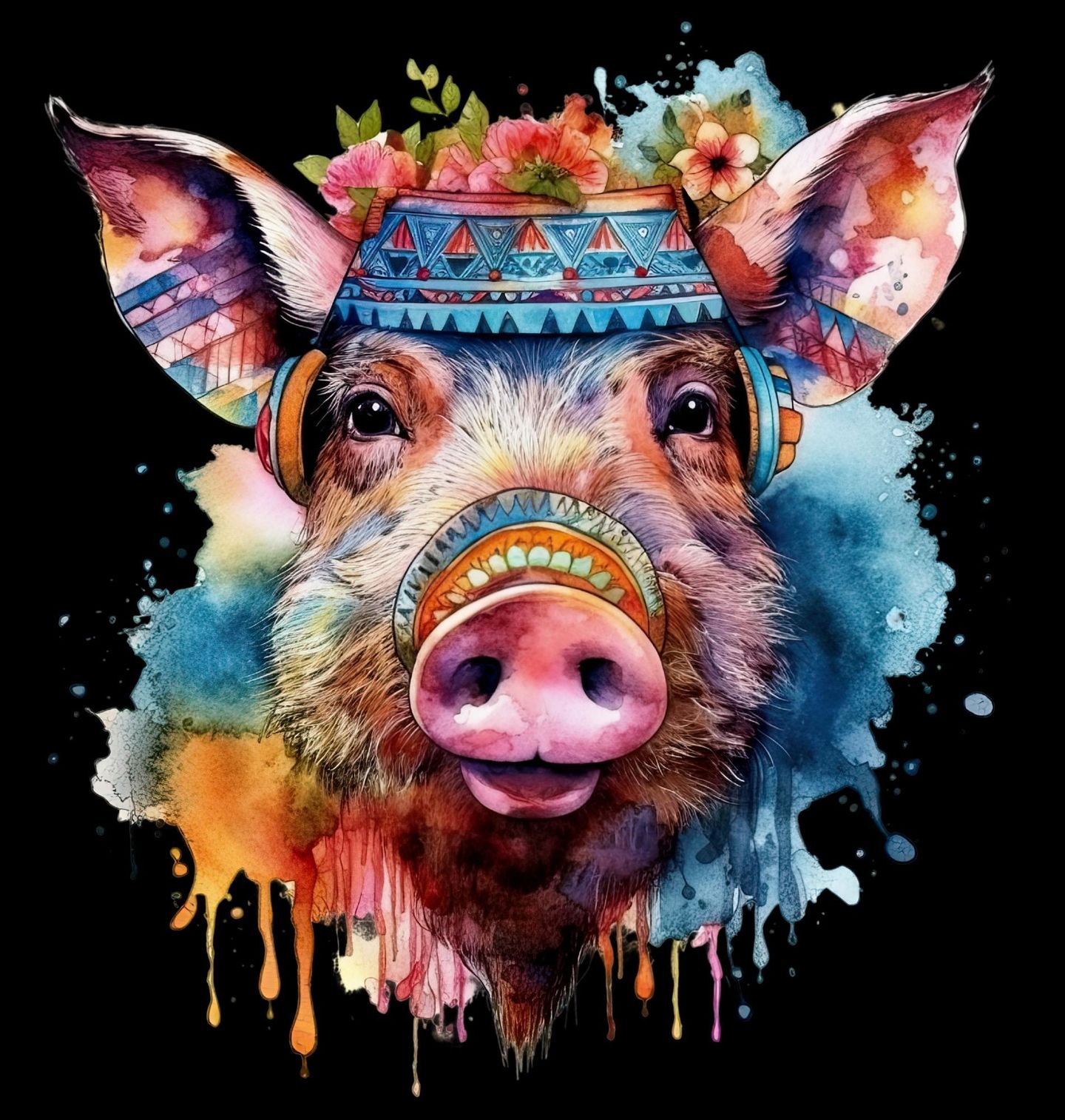 Pánské tričko Barevné Prase Boho. Tento hravý a originální motiv zobrazuje usměvavého vepře v boho stylu, zdobené pestrobarevnou čelenkou a květy. Akvarelové barvy vytvářejí veselý, pozitivní a lehce pohádkový dojem, který potěší všechny milovníky zvířat a venkova. Motiv připomíná bezstarostnou atmosféru, kterou dokáže nabídnout jen farma – klid, pohodu a radost z obyčejných věcí.
