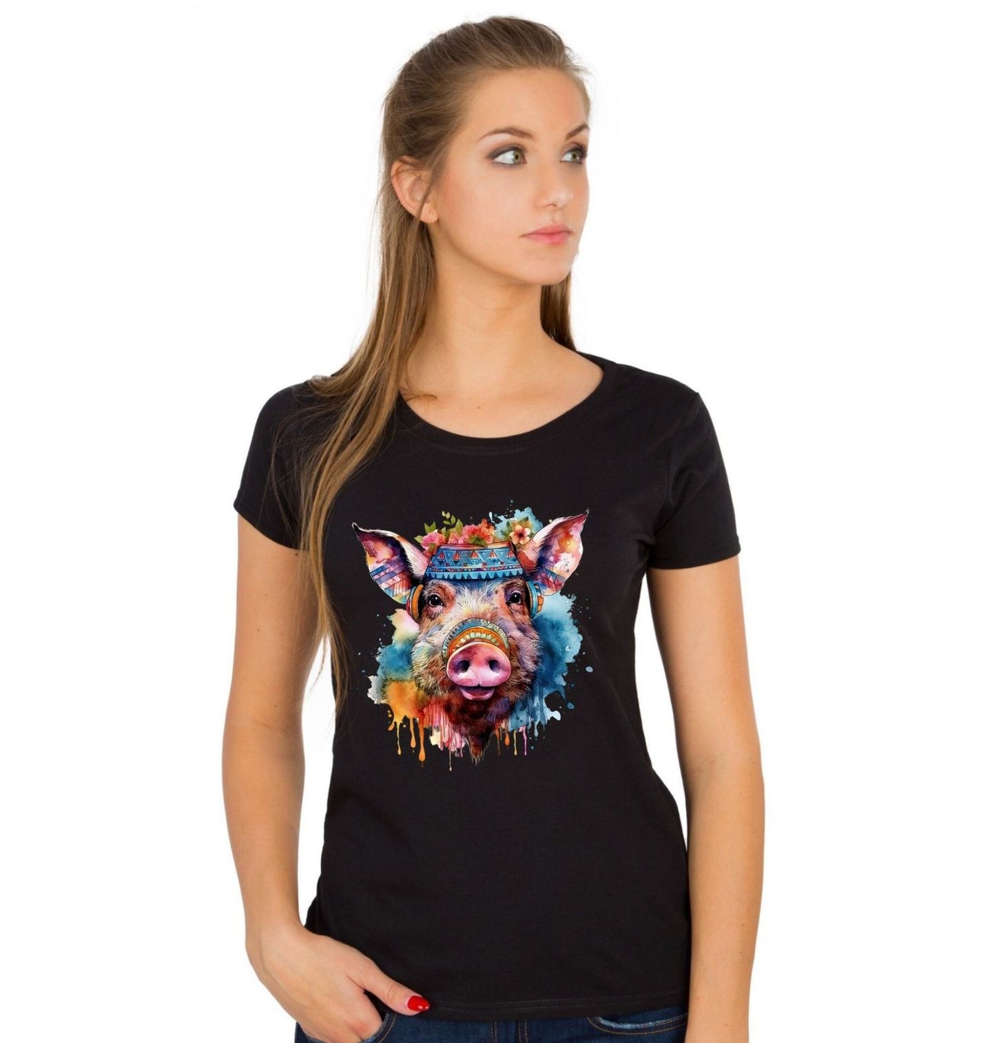 Dámské tričko Barevné Prase Boho. Tento hravý a originální motiv zobrazuje usměvavého vepře v boho stylu, zdobené pestrobarevnou čelenkou a květy. Akvarelové barvy vytvářejí veselý, pozitivní a lehce pohádkový dojem, který potěší všechny milovníky zvířat a venkova. Motiv připomíná bezstarostnou atmosféru, kterou dokáže nabídnout jen farma – klid, pohodu a radost z obyčejných věcí.