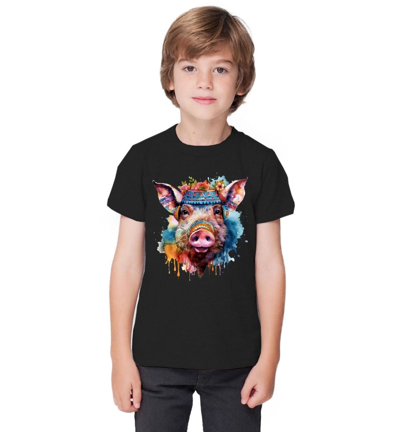 Dětské tričko Barevné Prase Boho. Tento hravý a originální motiv zobrazuje usměvavého vepře v boho stylu, zdobené pestrobarevnou čelenkou a květy. Akvarelové barvy vytvářejí veselý, pozitivní a lehce pohádkový dojem, který potěší všechny milovníky zvířat a venkova. Motiv připomíná bezstarostnou atmosféru, kterou dokáže nabídnout jen farma – klid, pohodu a radost z obyčejných věcí.