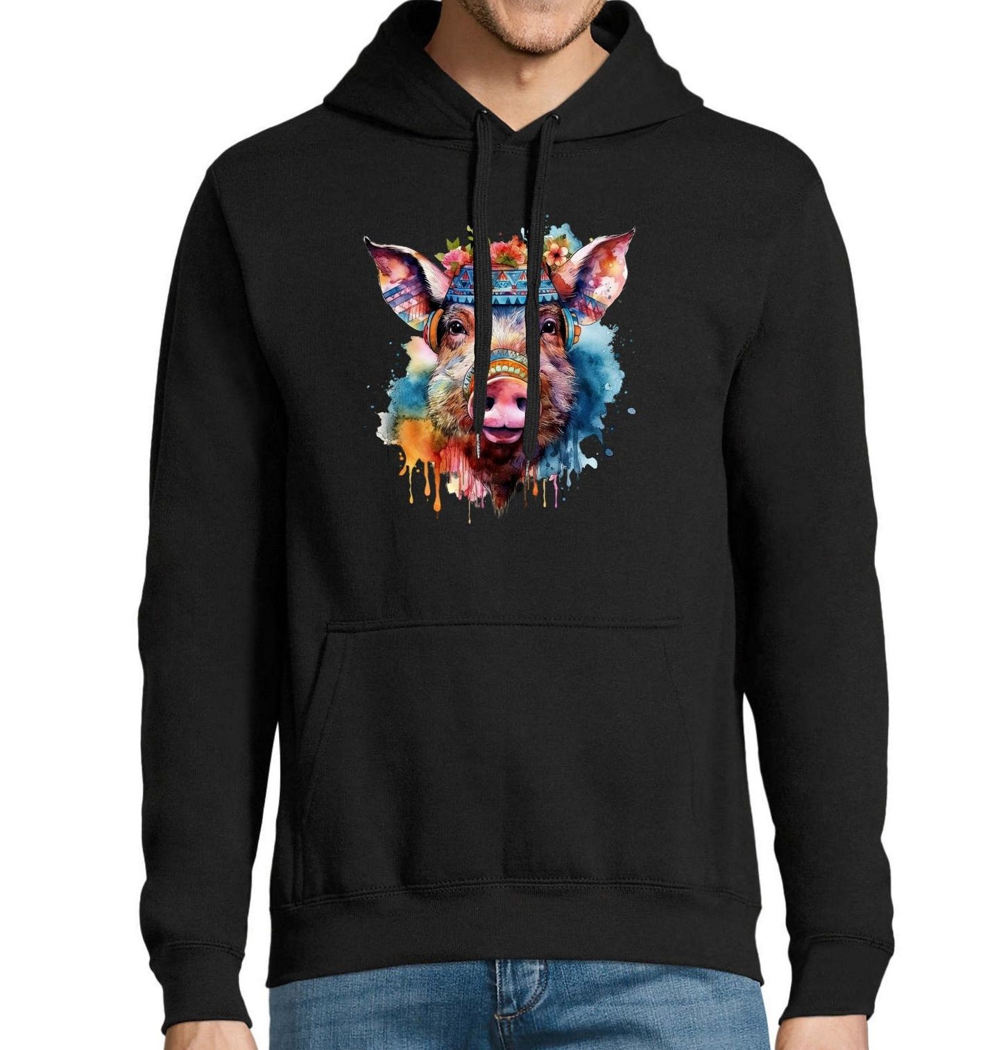 Pánská mikina Barevné Prase Boho. Tento hravý a originální motiv zobrazuje usměvavého vepře v boho stylu, zdobené pestrobarevnou čelenkou a květy. Akvarelové barvy vytvářejí veselý, pozitivní a lehce pohádkový dojem, který potěší všechny milovníky zvířat a venkova. Motiv připomíná bezstarostnou atmosféru, kterou dokáže nabídnout jen farma – klid, pohodu a radost z obyčejných věcí.