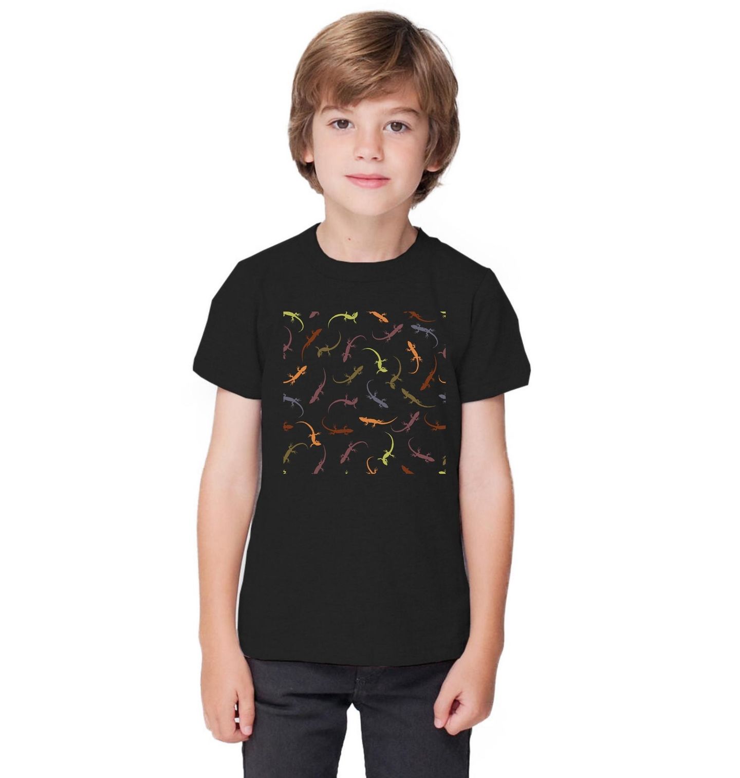 Dětské tričko Barevní Gekoni. Opakující se vzor s barevnými siluetami, které znázorňují ještěrky v různých polohách a směrech. Motiv ocení každý terarista, milovník plazů a přírody, kterého fascinuje svět zvířat chovaných v teráriu. Gekon patří mezi oblíbené terarijní druhy díky svému vzhledu i nenáročnosti na chov, a právě to tento design přirozeně připomíná.