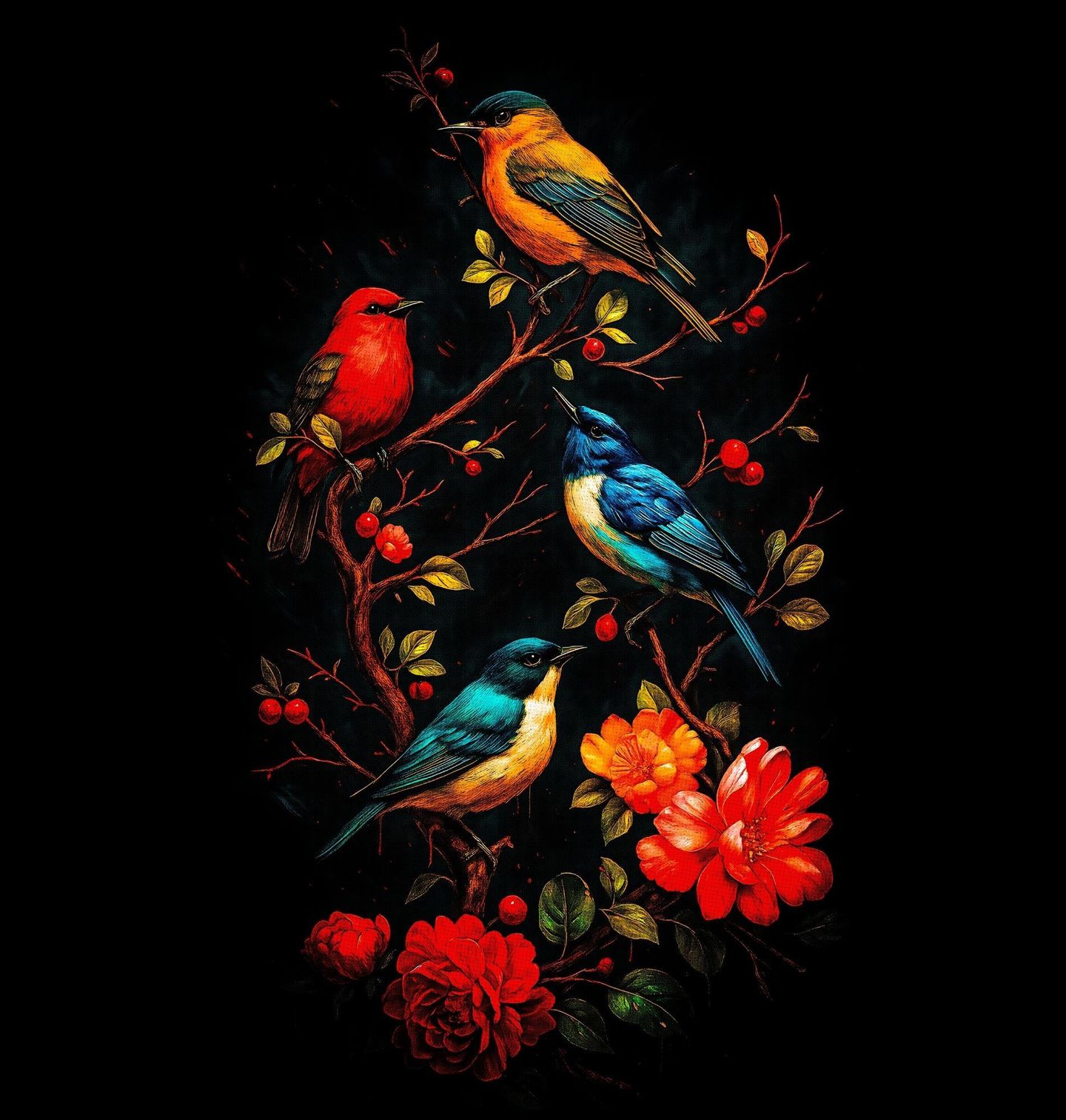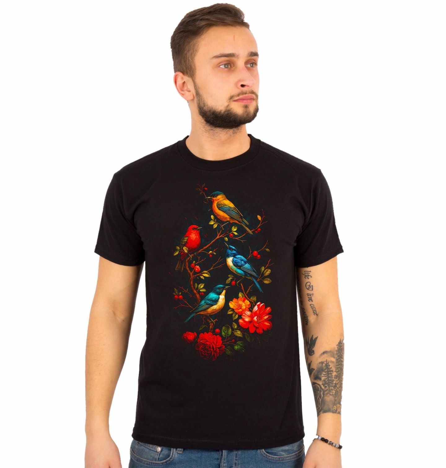 Pánské tričko Barevní Zpěvní Ptáčci. Tento jedinečný motiv zachycuje zpěvné ptáky v podobě umělecké ilustrace inspirované evropskými pěvci, jako je pěnkava, červenka či modráček. Barevná kompozice ptáků usazených na větvích mezi květy symbolizuje harmonii, klid a propojení s přírodou.